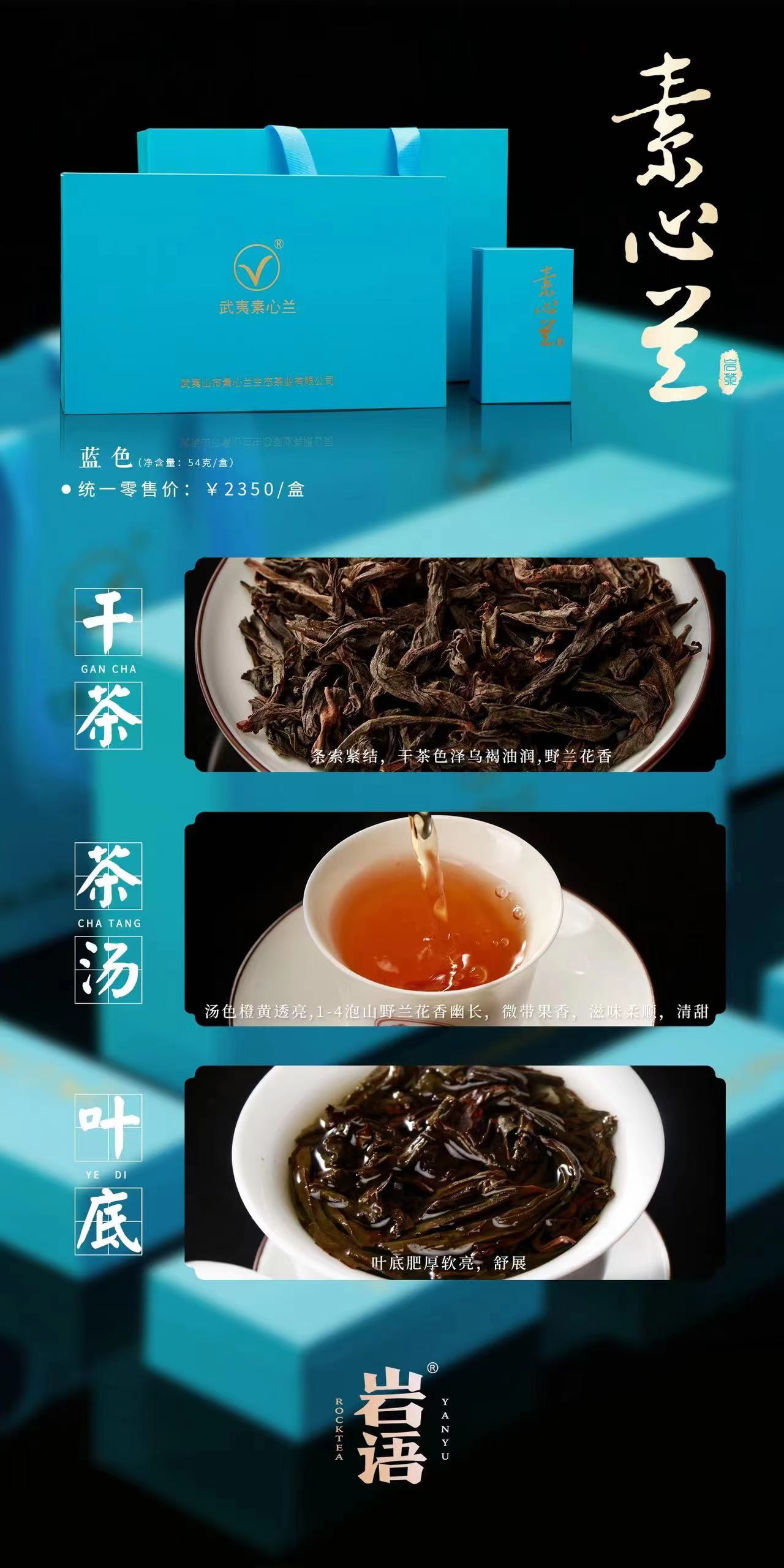 第一款是轻香型素心兰,蓝色包装。主要原料采自马头岩的优质水仙,拼配模拟传统素心兰优质奇种菜茶。采用创新独特工艺、轻火慢焙精制。外形条索紧结粗壮、青褐色,汤色橙黄透亮,淡淡兰花香悠长、绵柔。汤水顺滑、清甜、略带果味。叶底软亮、舒展,带有红边。