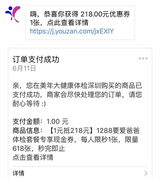 方法1: 下单成功后,【美年大健康深圳】微信公众号会推送现金券链接,您可以点击查看; 如下图: