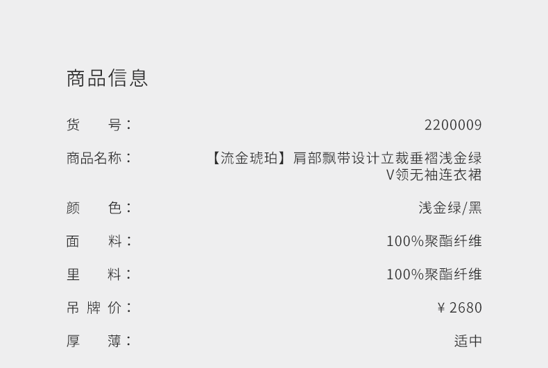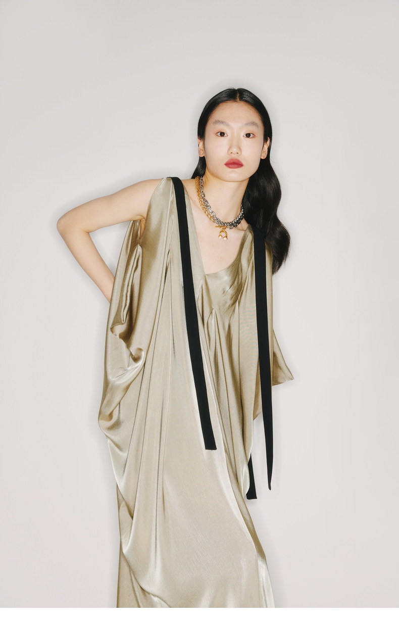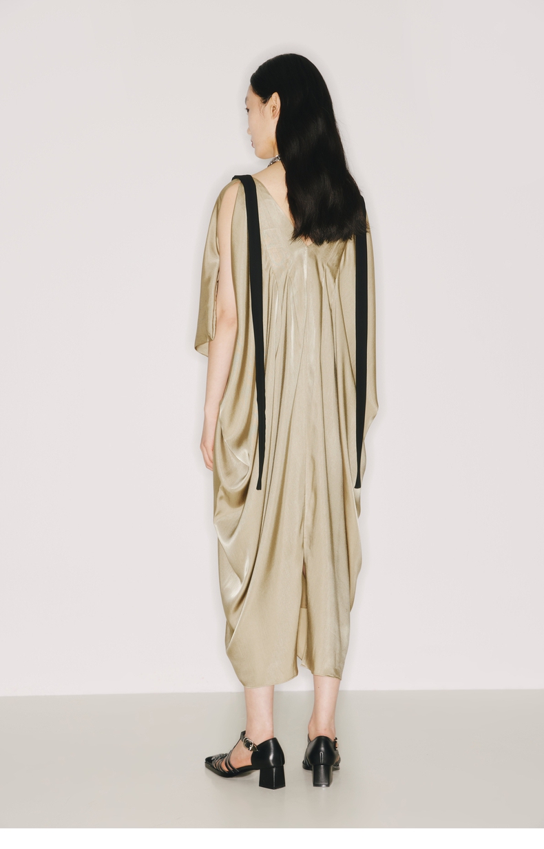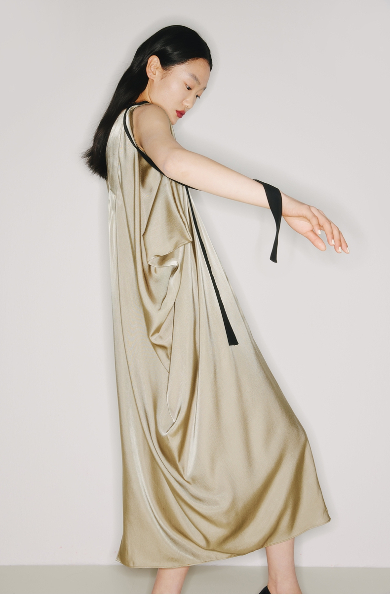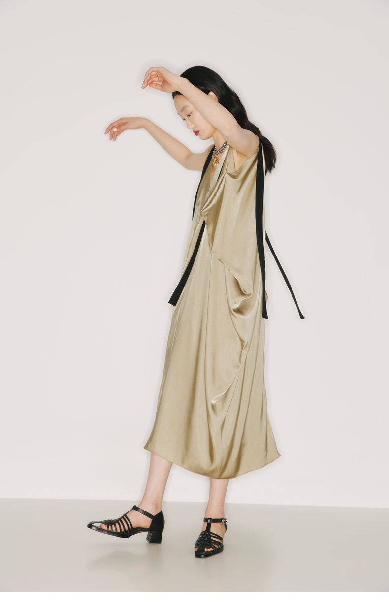 【流金琥珀】肩部飘带设计立裁垂褶浅金绿V领无袖连衣裙/2200009
