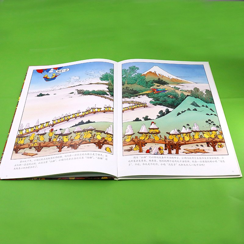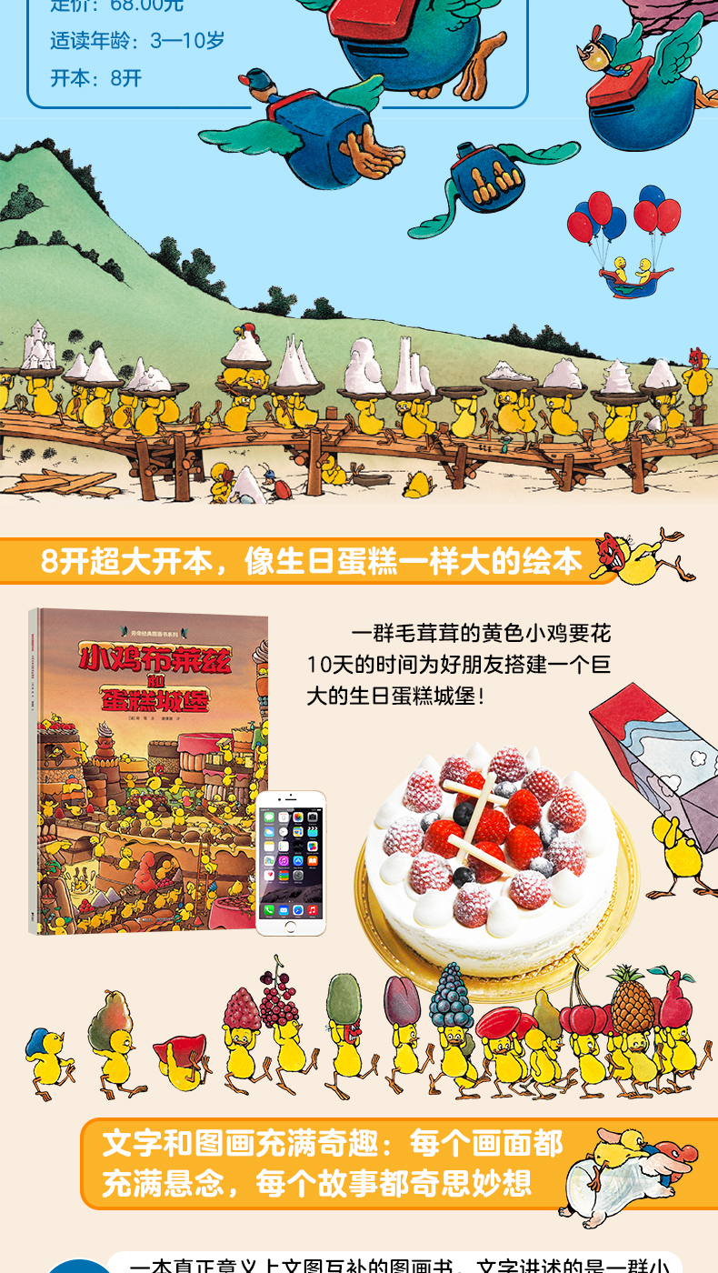 文字讲述的是一群小鸡为生日快乐小姐搭建生日蛋糕城堡的简单故事,画面则想象力丰富,让小朋友们无边界地自由想象。