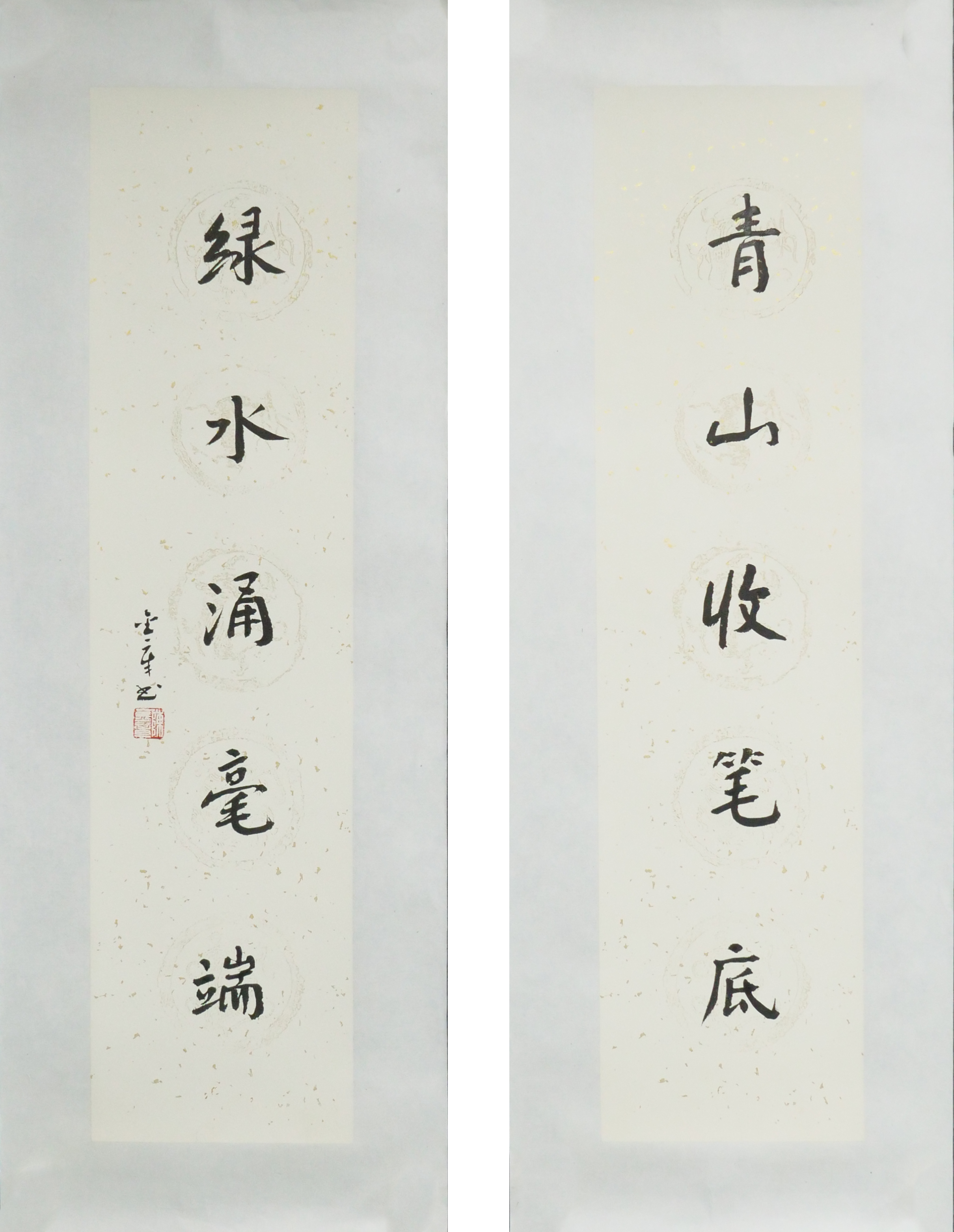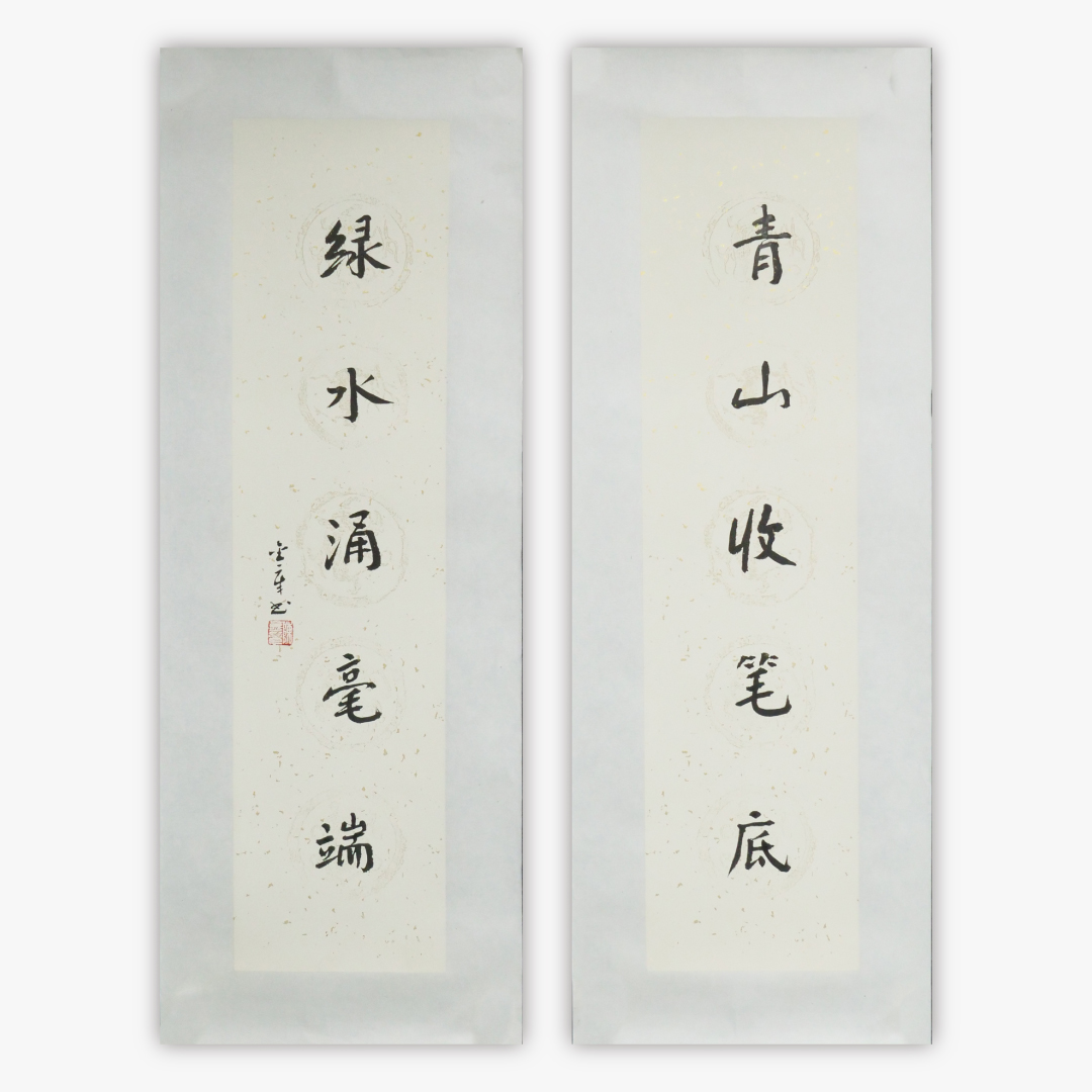 陈金章《青山收笔底 绿水涌毫端》书法原作67CM*17CM手写宣纸对联