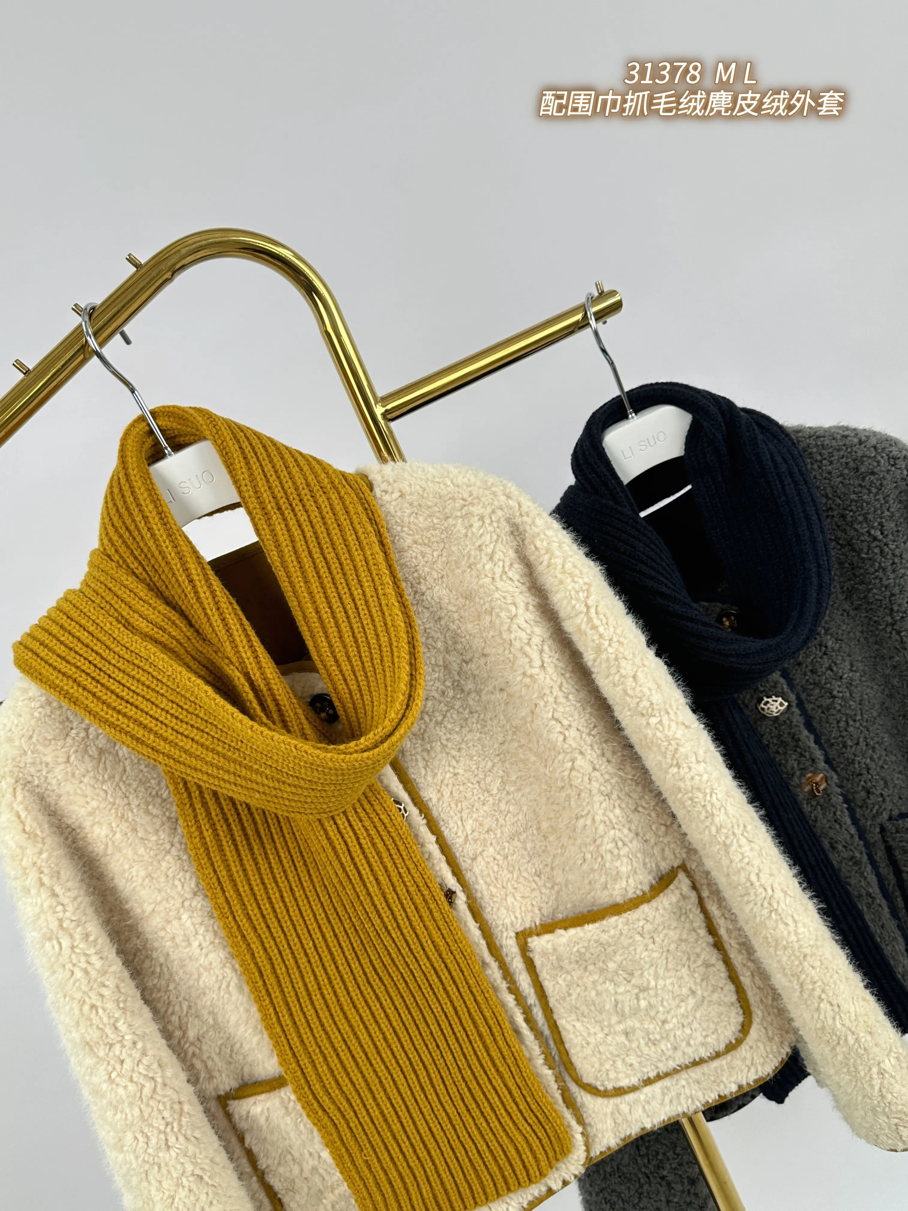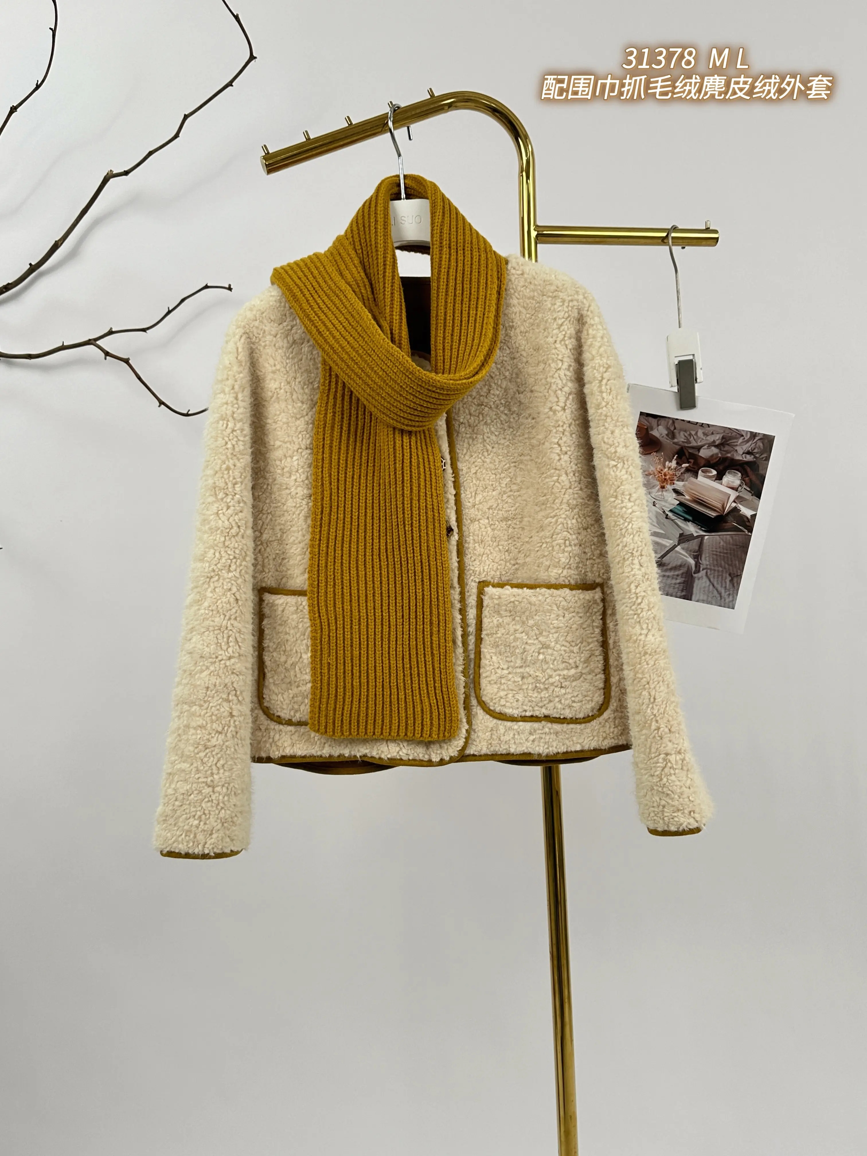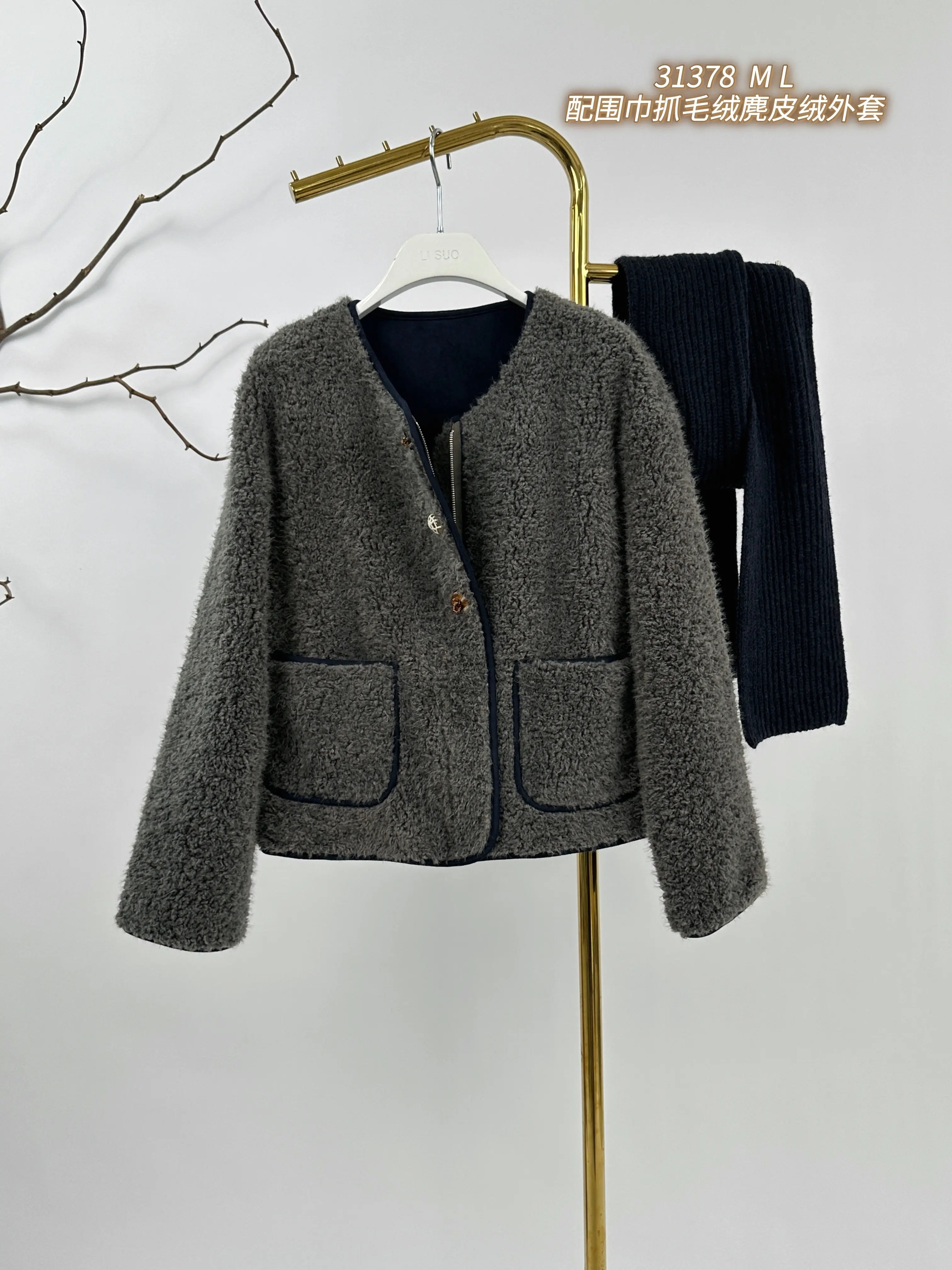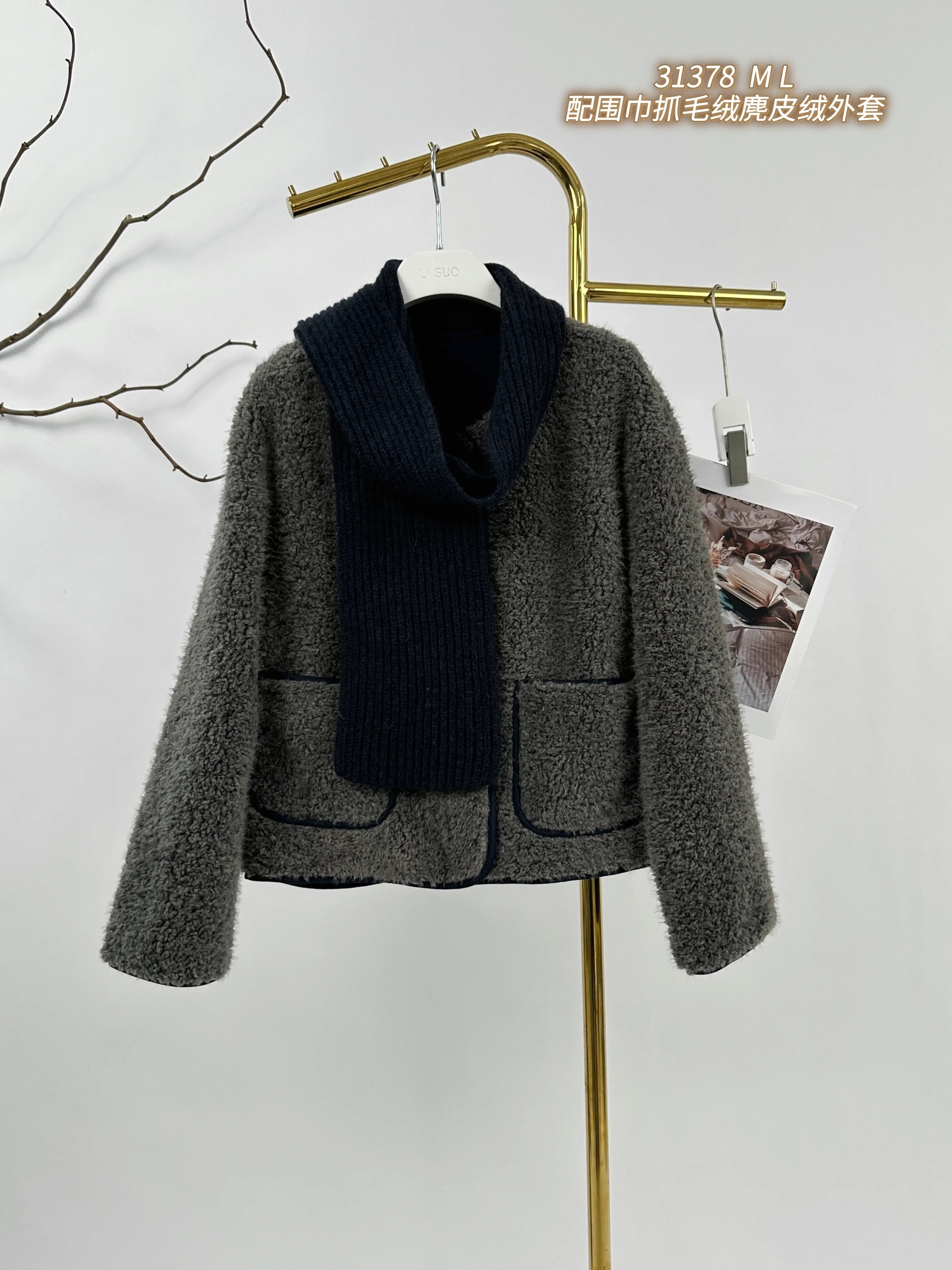 H5WT31378#配围巾抓毛绒麂皮绒外套