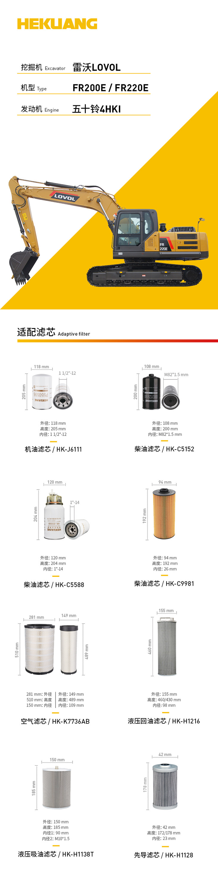 雷沃FR200E/220E(五十铃发动机4HK1)挖掘机滤清器 机油柴油空气滤芯 液压油先导滤芯