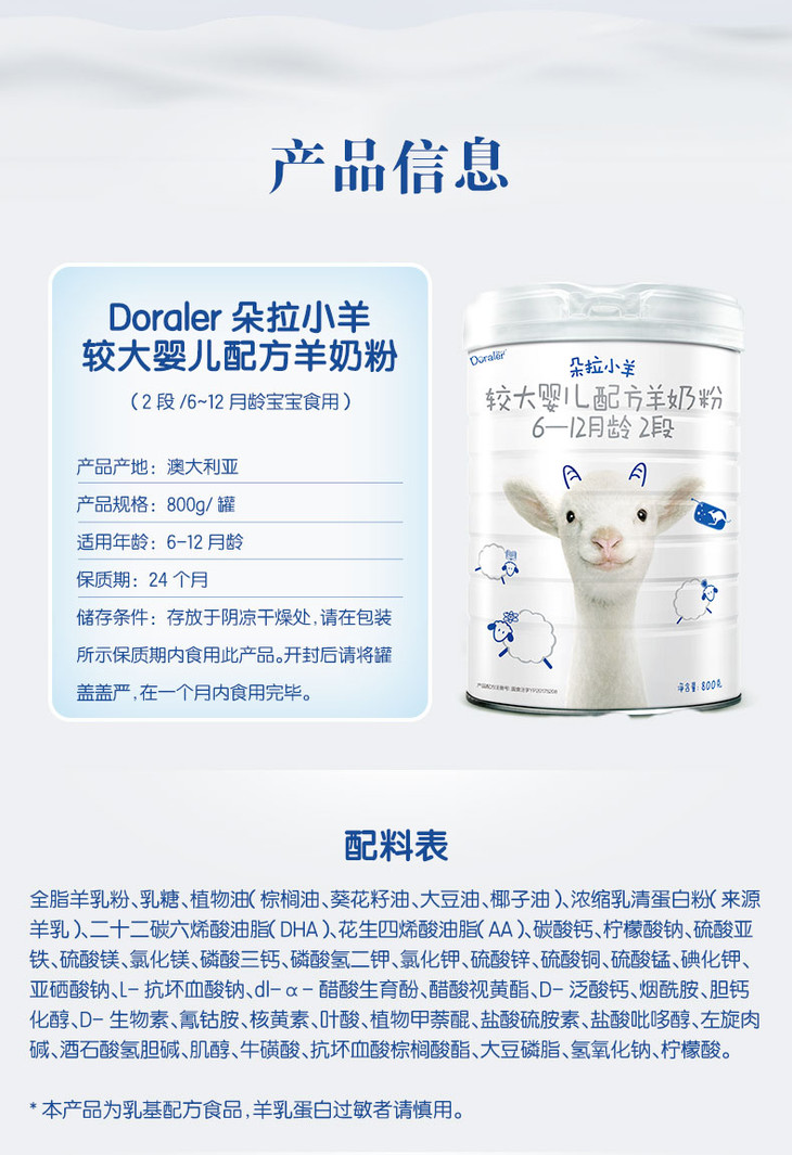 澳洲Doraler朵拉小羊婴幼儿配方羊奶粉2段6-12个月800g(2022年4月)