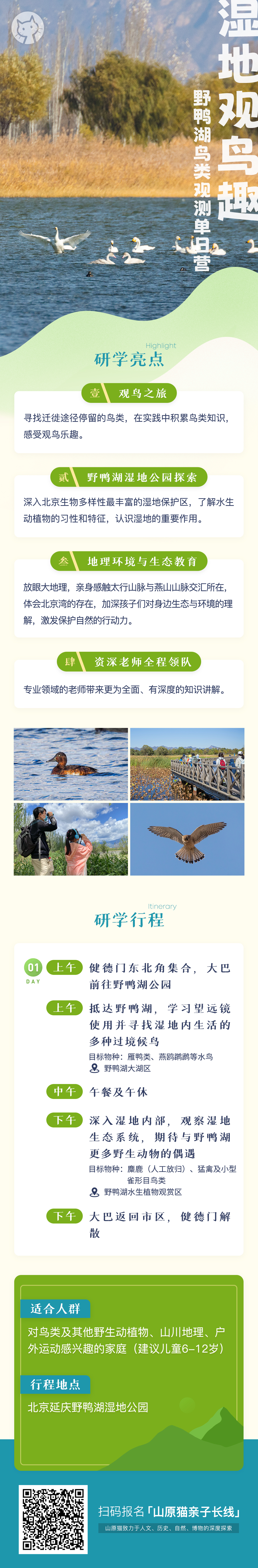 一同走进野鸭湖,开启动植物发现探索之行。无论是植物、鸟类、鱼类,甚至足够幸运遇到的哺乳动物,都在这一天的任务列表内。小朋友们将在资深博物老师的带领下,去发现这里的有趣细节。