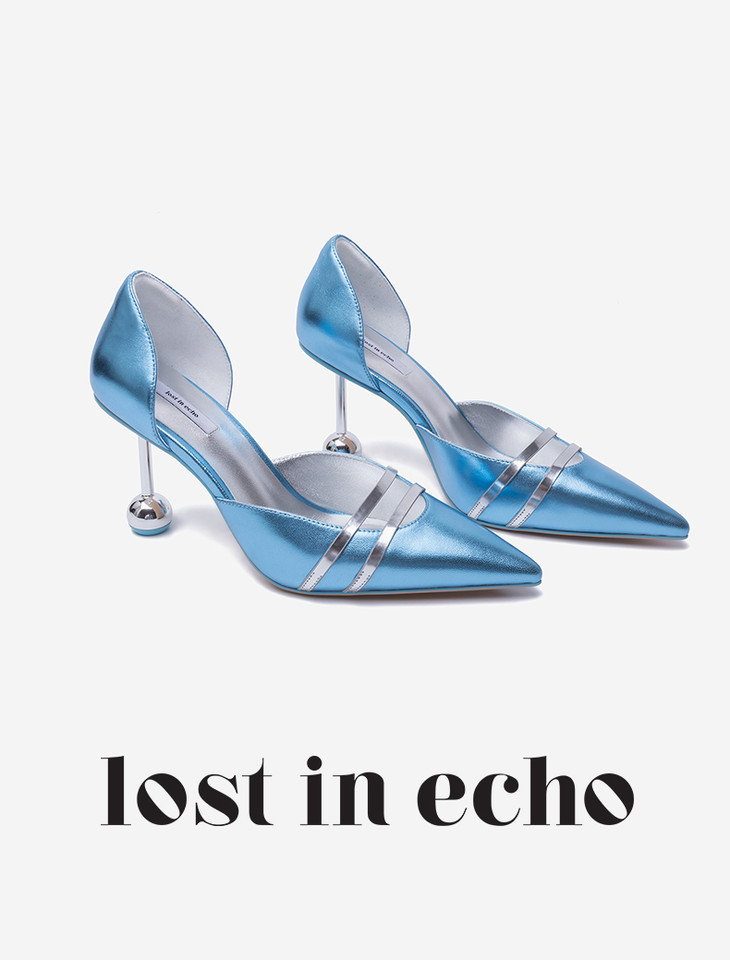 lost in echo蓝色中空双条带高跟单鞋 时尚尖头双球跟女鞋