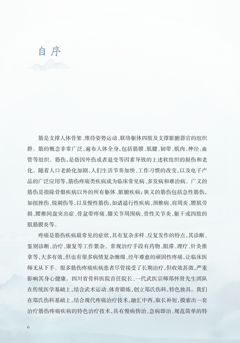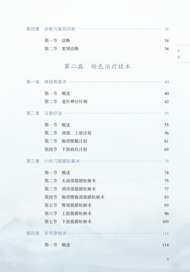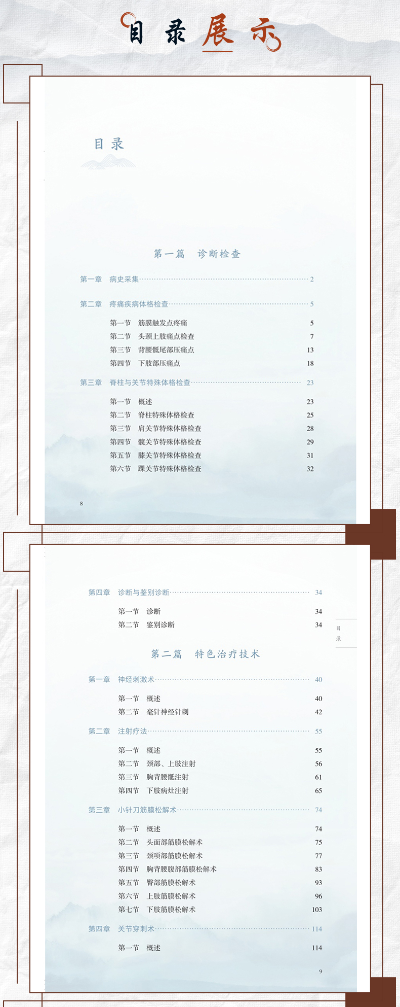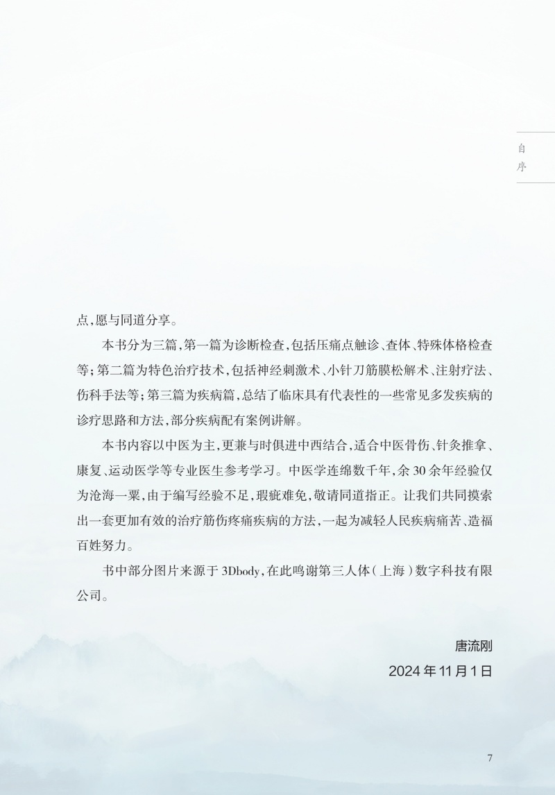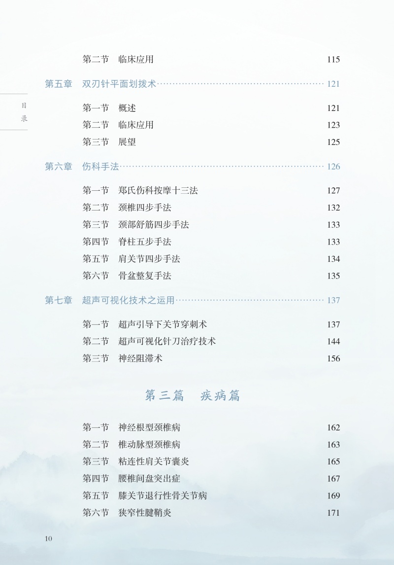 唐流刚主任坚持临床一线工作30余年,在中医传统技术基础上,结合郑氏伤科特色与现代医学,汇集筋伤整复、针灸、针刀、疼痛阻滞、现代康复等操作技术,灵活运用于各类复杂、顽固性筋伤疼痛类疾病,具有简便、安全、效佳、价廉等优势,本书为对其多年临床经验实践的总结。本书分为三篇,**篇为诊断检查,包括压痛点触诊、查体等;**篇为技术操作,包括神经针刺术、筋膜针刀、注射技术、郑氏伤科手法等;第三篇为疾病治疗,总结临床具有代表性的一些常见多发筋伤疼痛病症的诊疗思路和治疗方案。本书图文并茂,实践操作可重复性强,易于推广,对筋伤、推拿、疼痛、康复等科临床医师有一定的参考价值。