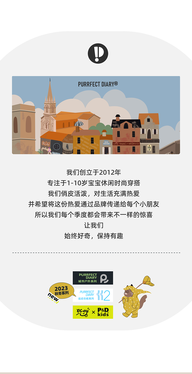 - Purrfect-Diary专注于贴近自然随性的穿着概念,轻奢平价的童装文化传播,在产品设计上更加注重婴童穿着的舒适性、安全性、更出众的国际化品牌,将欧美的育婴文化在中国进行深入的传播与推广。