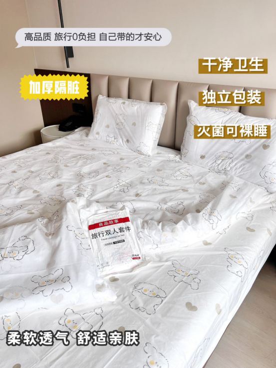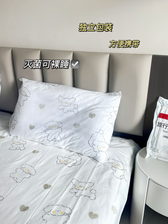 酒店不整洁,整理不到位,负面新闻频频出现怎么办 总不能把自家的床搬过来吧~ 尤其经过三年疫情,大家都知道卫生问题是重中之重。 所以只要出门需要住酒店的,一定要带上非常便捷的一次性酒店套装。