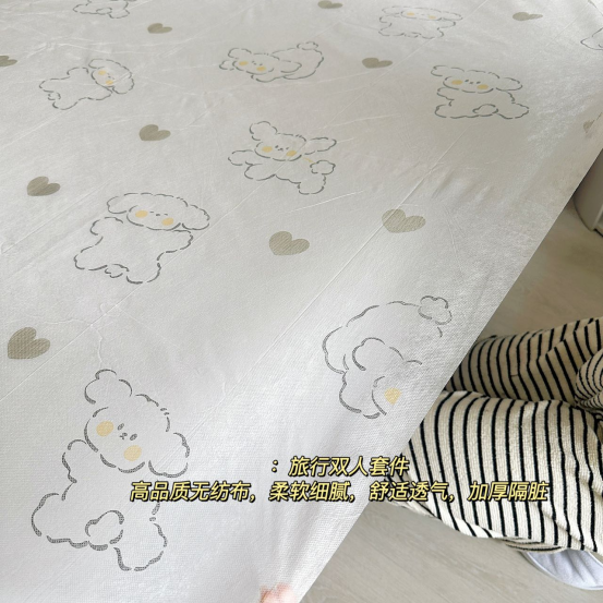 旅行双人套件 身处职场,出差总是不可避免的,路途本来就够累, 如果再睡不好就真的是磨难,一次性四件套可以解决不少问题。 坐过火车的人都清楚卧铺的床有多不干净,独立真空包装, 方便携带也不占空间,对常出差的人来说真的是很方便了。 用它隔开酒店的被子、床单、枕头安心睡觉, 再也不用提心吊胆地和陌生人共用床品! 无论是住酒店、躺火车、医院病房还是露营, 带着它在哪儿都能睡出在家的安全感。