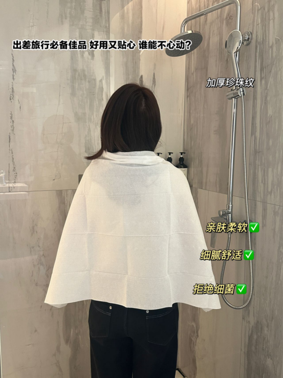 棉柔浴巾 独立包装,方便携带即取即用,可反复使用!直接在行李箱里丢个几包, 也不怎么占地方并且像这种大块的一次性浴巾,比压缩型的好多了。 加厚珍珠纹的构造加强了与皮肤之间的贴合,能够深层吸水, 而且不易起毛絮,带给肌肤的触感更加柔软舒爽! 接触人的皮肤,使人感到柔软而不僵硬。不仅如此,连细节设计也是非常贴心到位~ 遇水瞬间吸收,尤其擦头发的时候,吸水快,用完之后还能拿来当抹布~