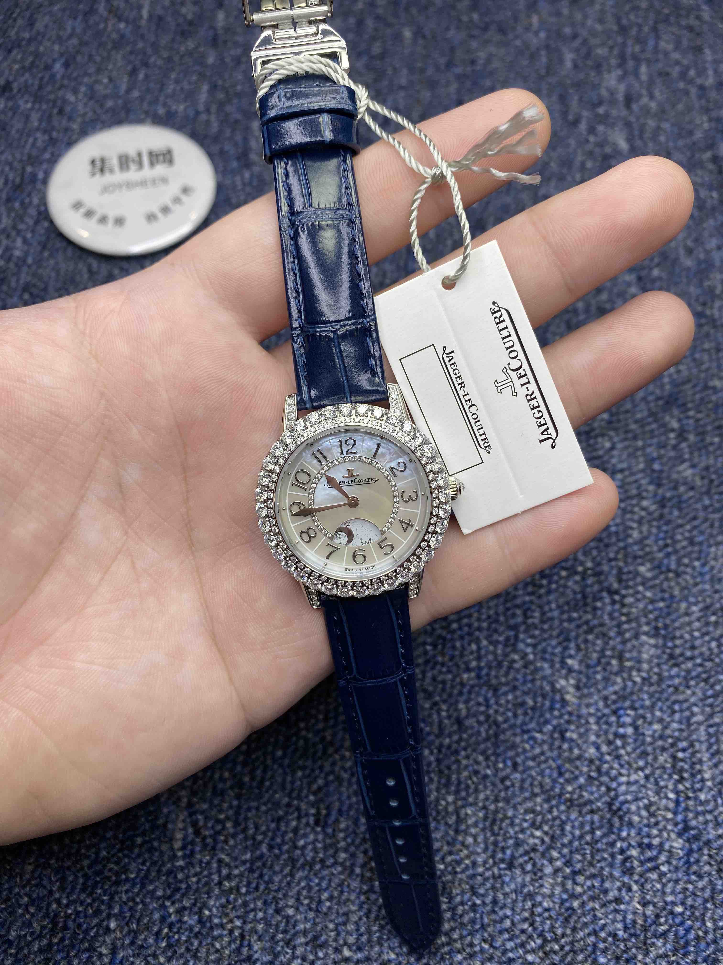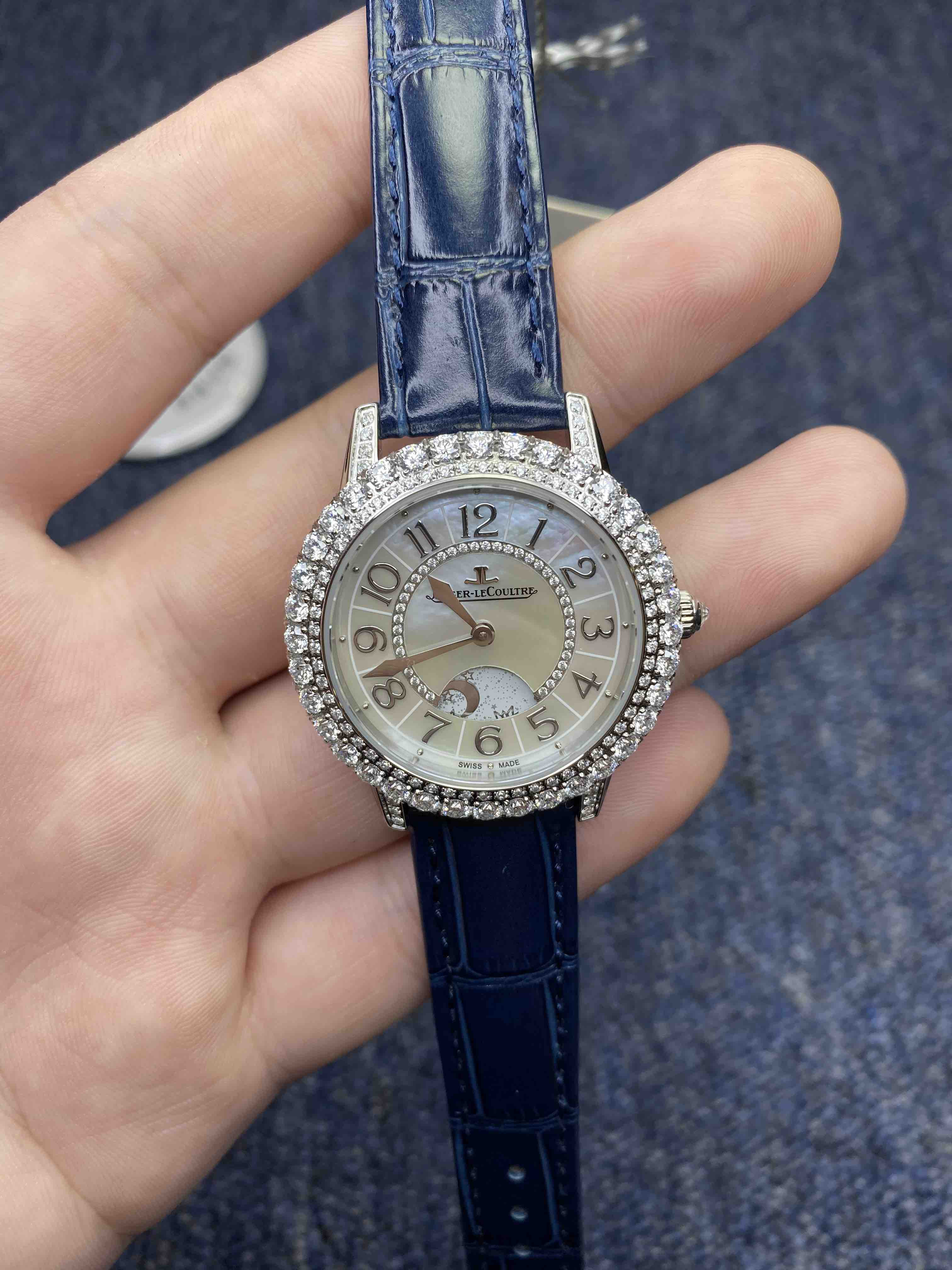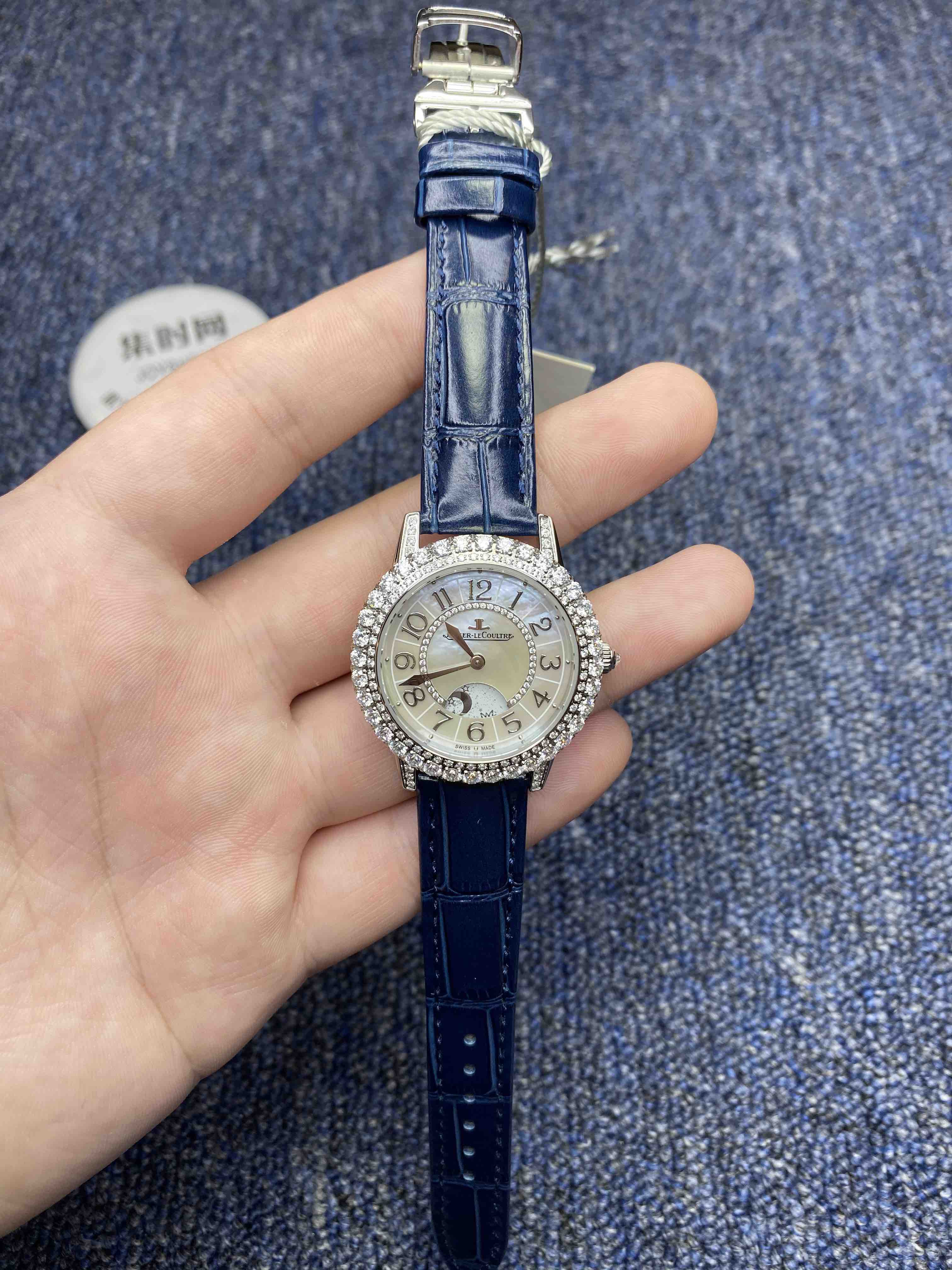 亲民版 积家 Dazzling Rendez-Vous Night & Day 约会系列月相显示珠宝腕表。本款腕表的每一个设计细节均彰显奢华大气与精准考究。精细的工艺能够展现明亮式切割钻石的天然魅力,而此款卓越的珠宝腕表正是其中翘楚。优雅无误地呈现时间,表盘上的天然珍珠母贝与花体数字时标及金色指针和谐呼应,一切无不精妙绝伦。完美诠释本系列腕表的全部亮点,让佩戴它的女士在无数迷人夜晚绽放魅力光芒,尽显无限魅力。