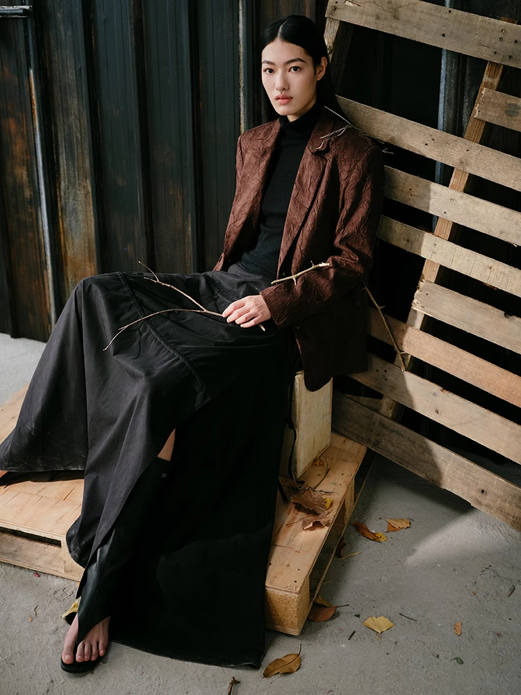 LIYIHAN 24秋新麂皮压褶廓形西装外套肌理缎面女复古风高级设计感