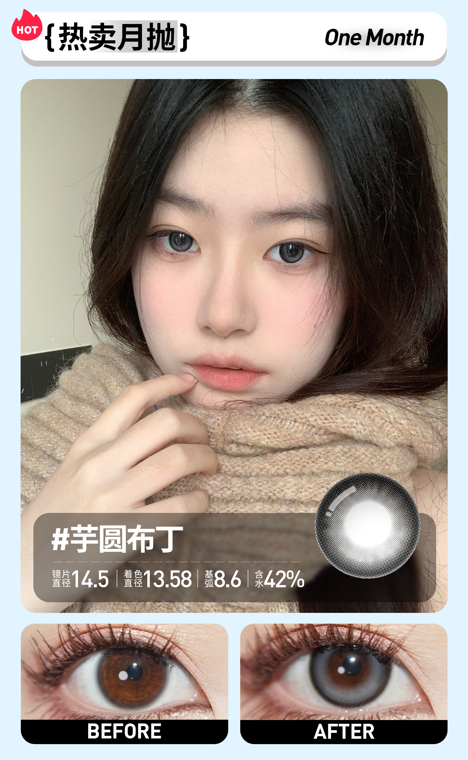 芋圆布丁14.5【买二送护理液】欧巴兰月抛美瞳灰色大小直径2片装 商品图0