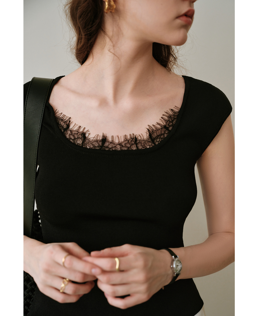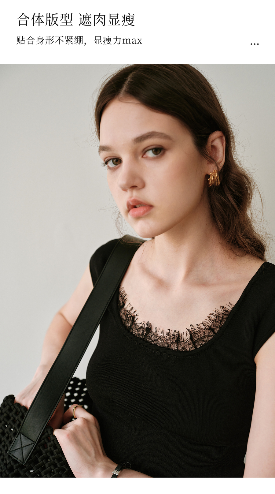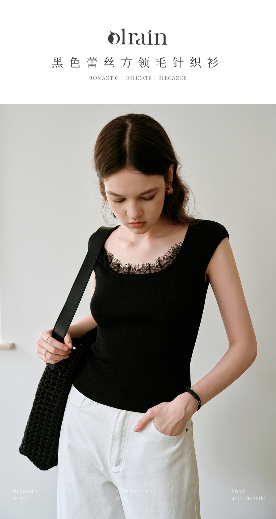 OLrain欧芮儿黑色蕾丝拼接方领毛针织衫夏季2025新款修身显瘦上衣