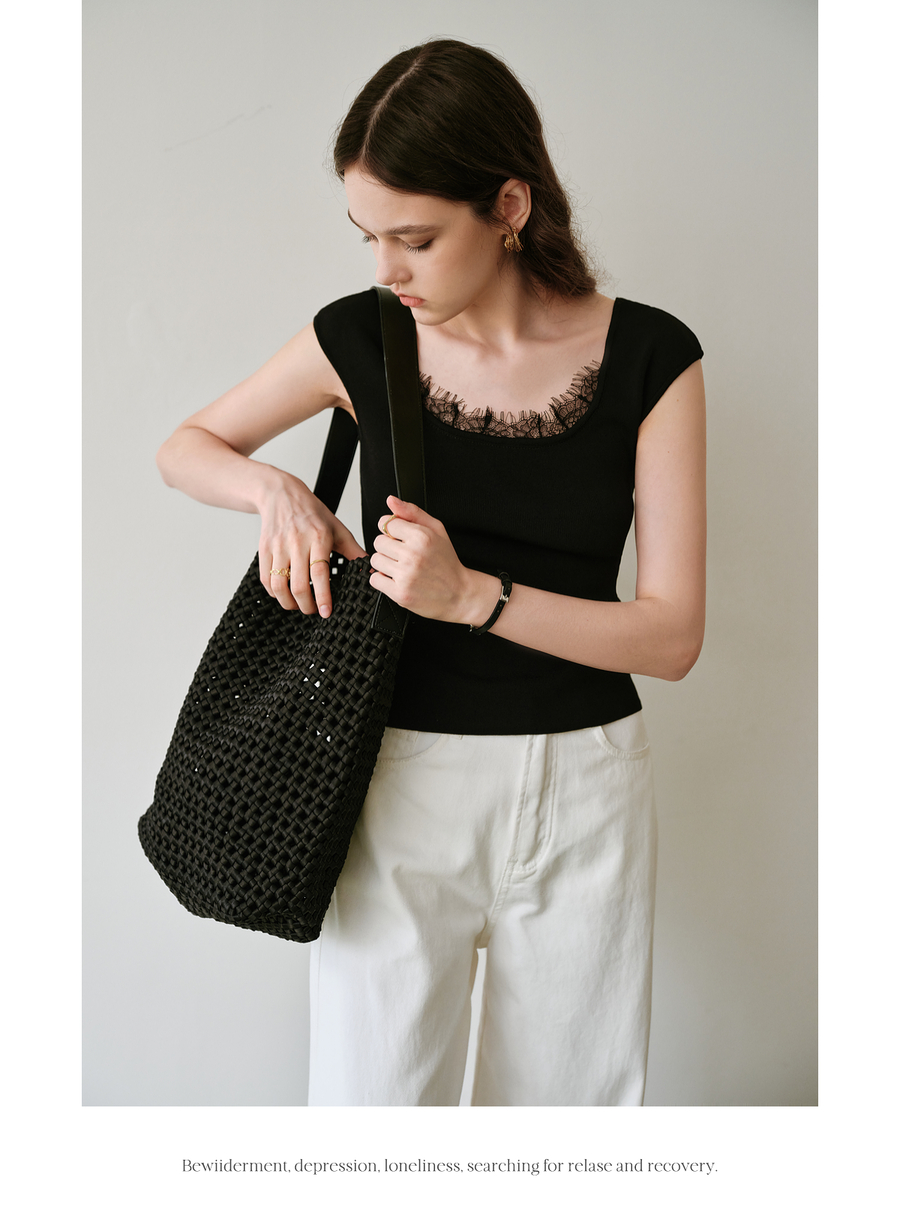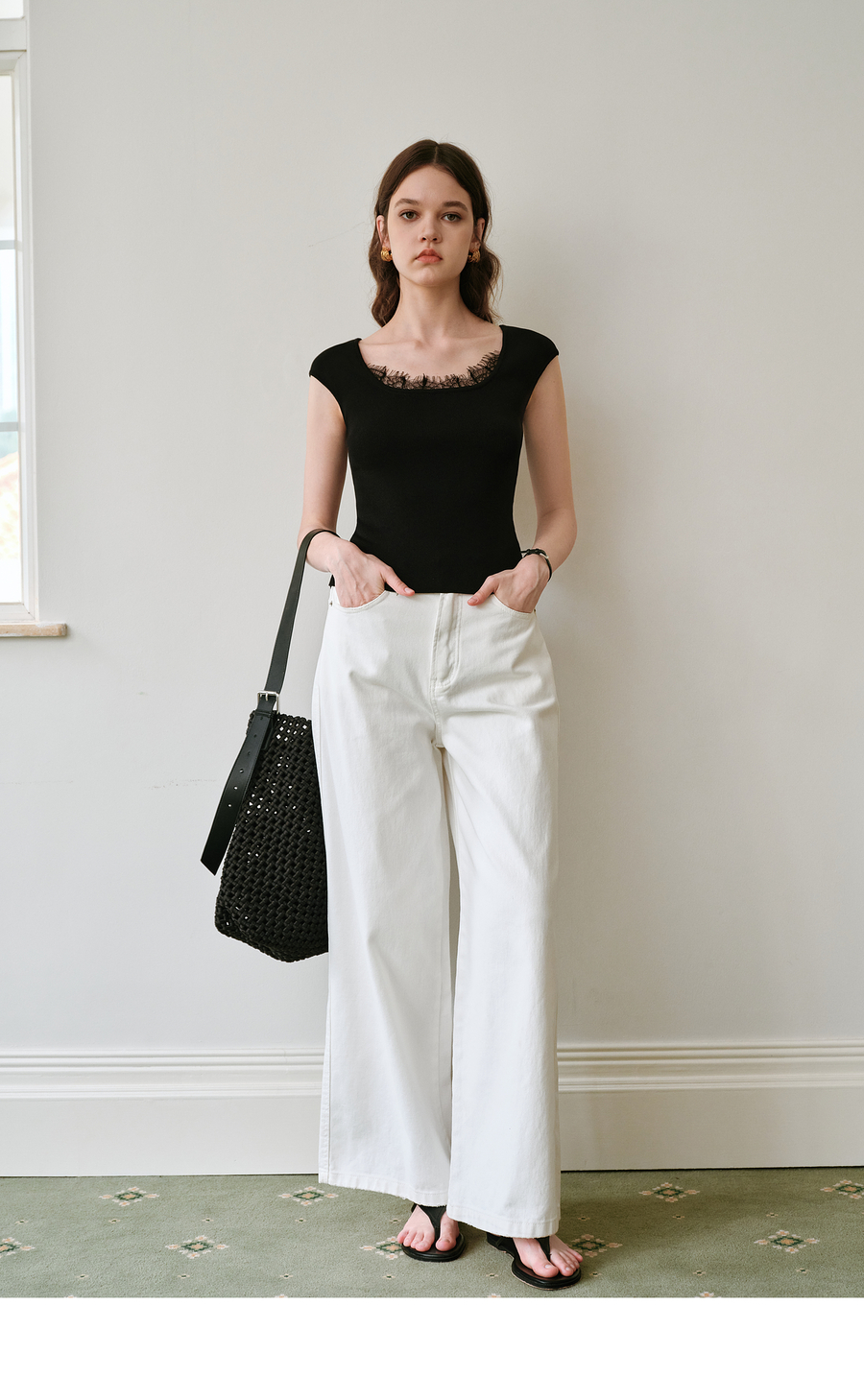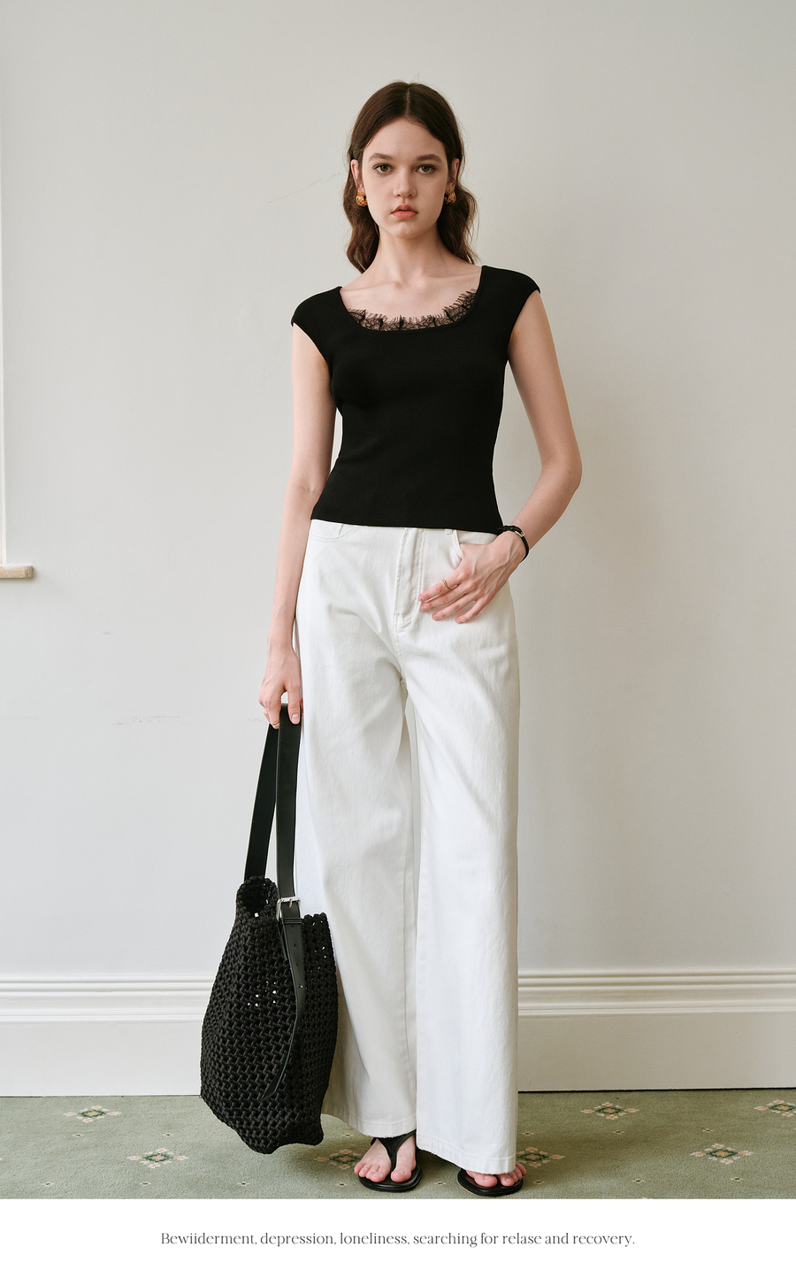 OLrain欧芮儿黑色蕾丝拼接方领毛针织衫夏季2025新款修身显瘦上衣