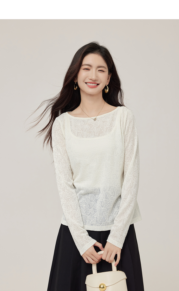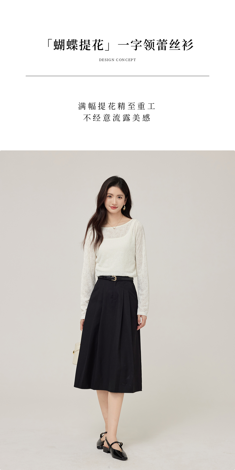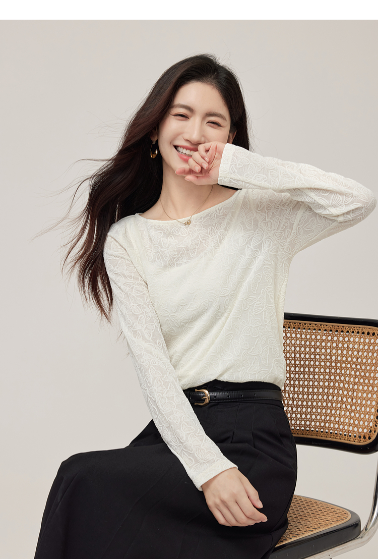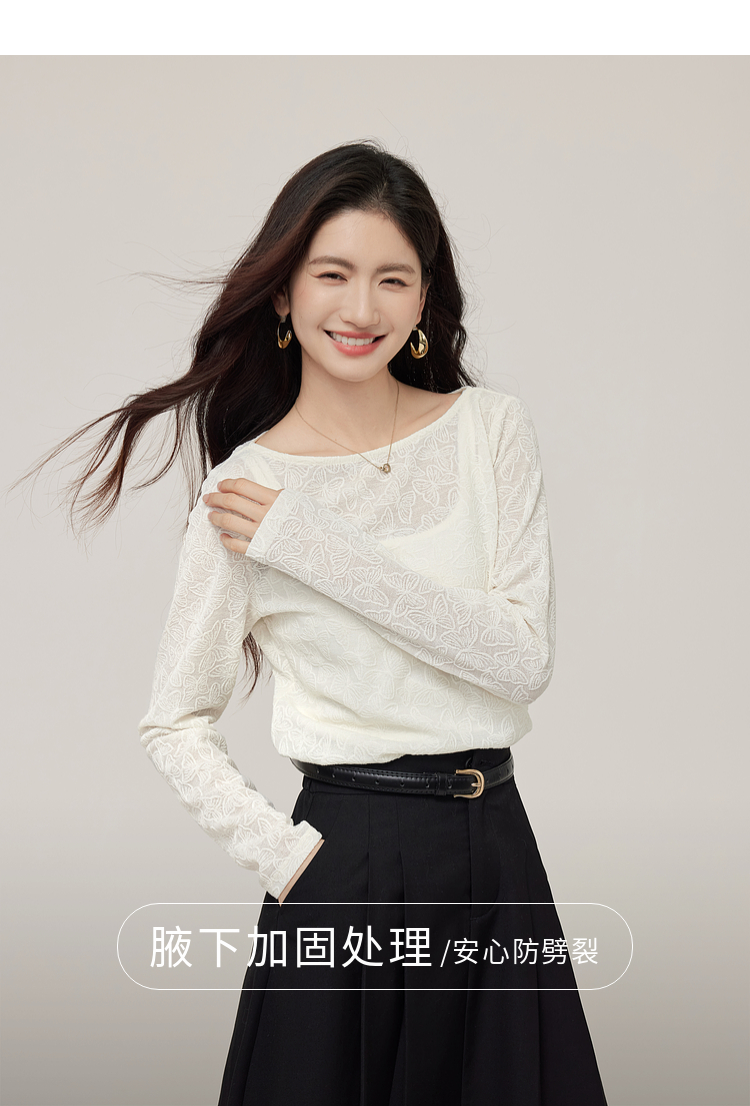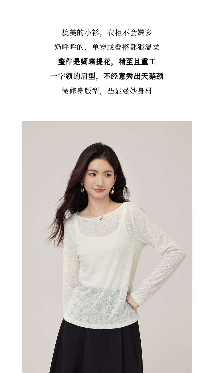 【08/19新品】熙世界蝴蝶提花蕾丝衫女长袖2025早秋新款优雅气质一字领T恤上衣