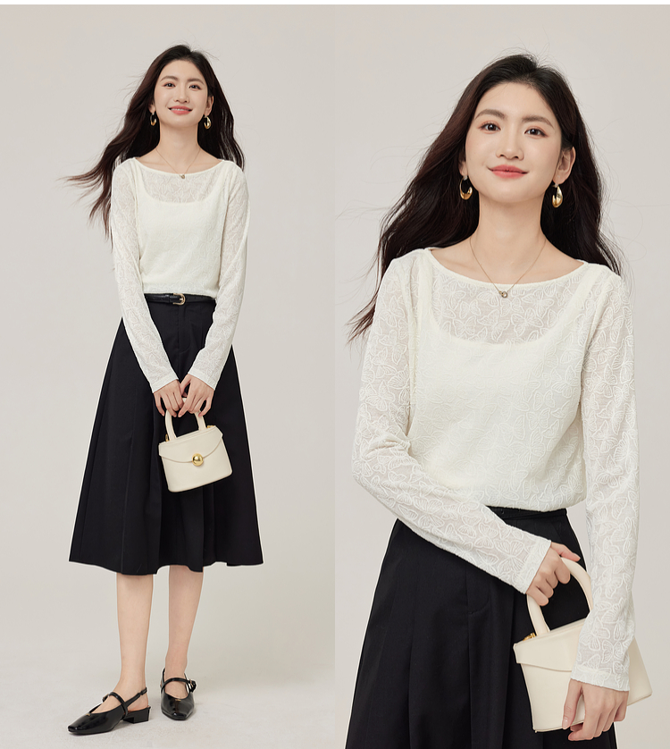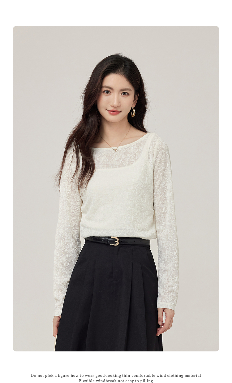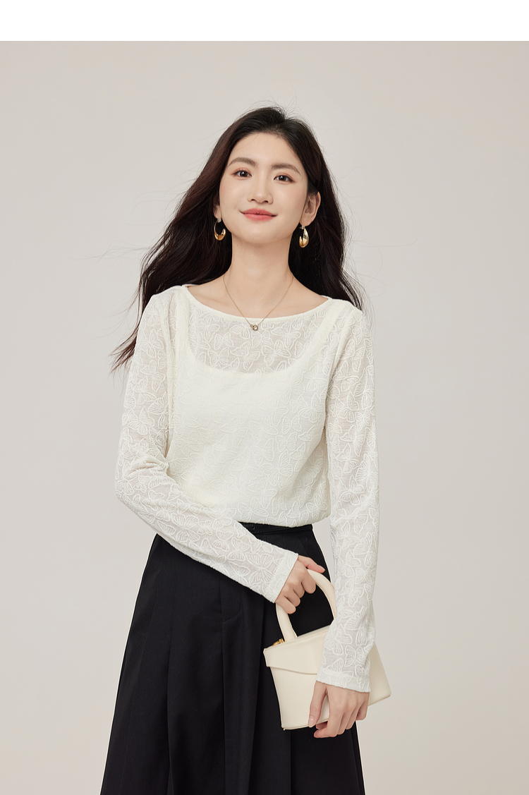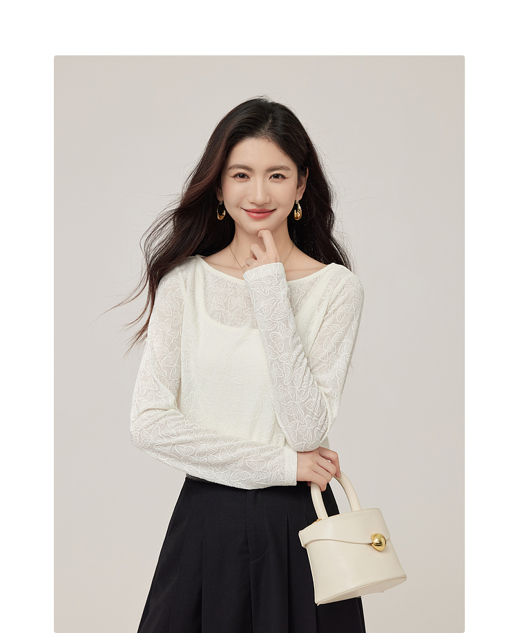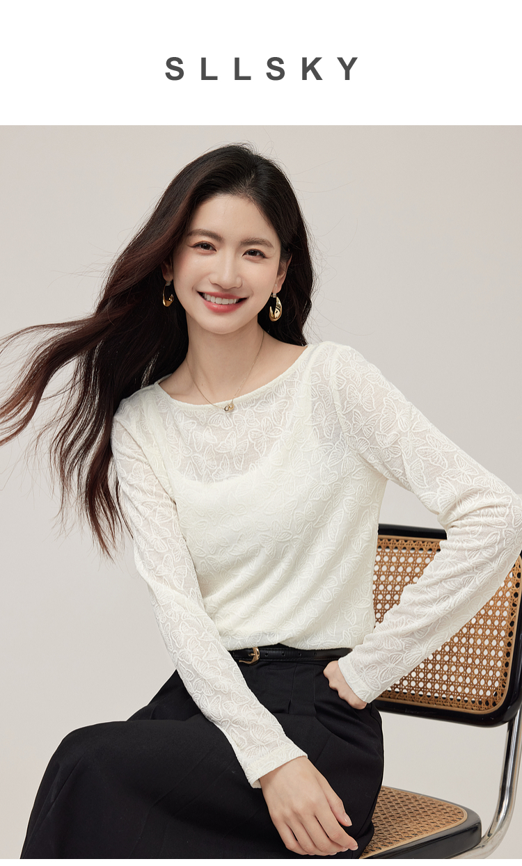 【08/19新品】熙世界蝴蝶提花蕾丝衫女长袖2025早秋新款优雅气质一字领T恤上衣