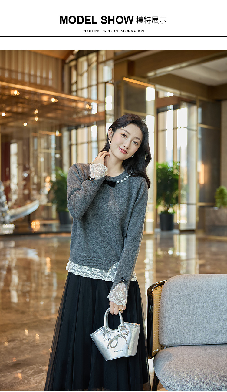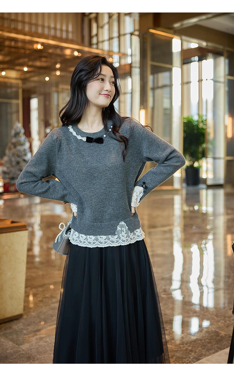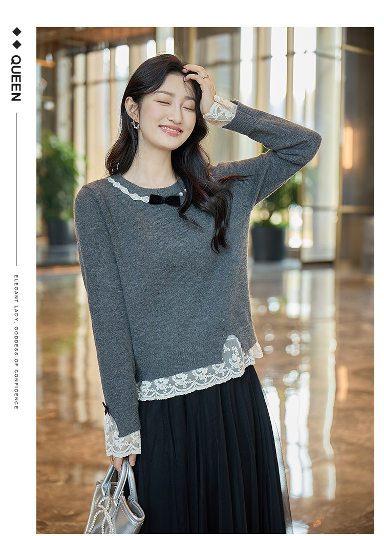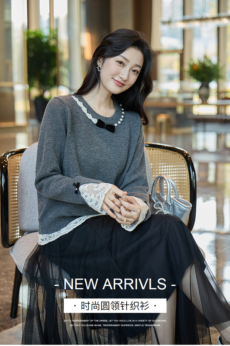 奢姿大码女装2025冬季时尚蕾丝设计圆领针织衫胖妹妹气质减龄上衣9854670713
