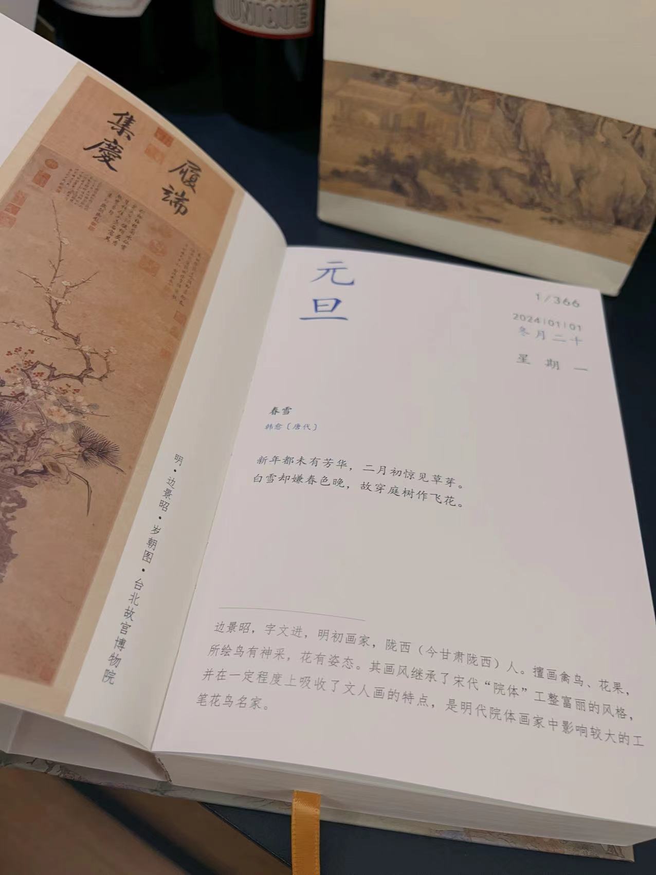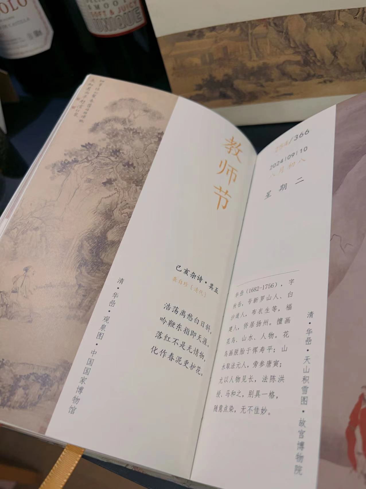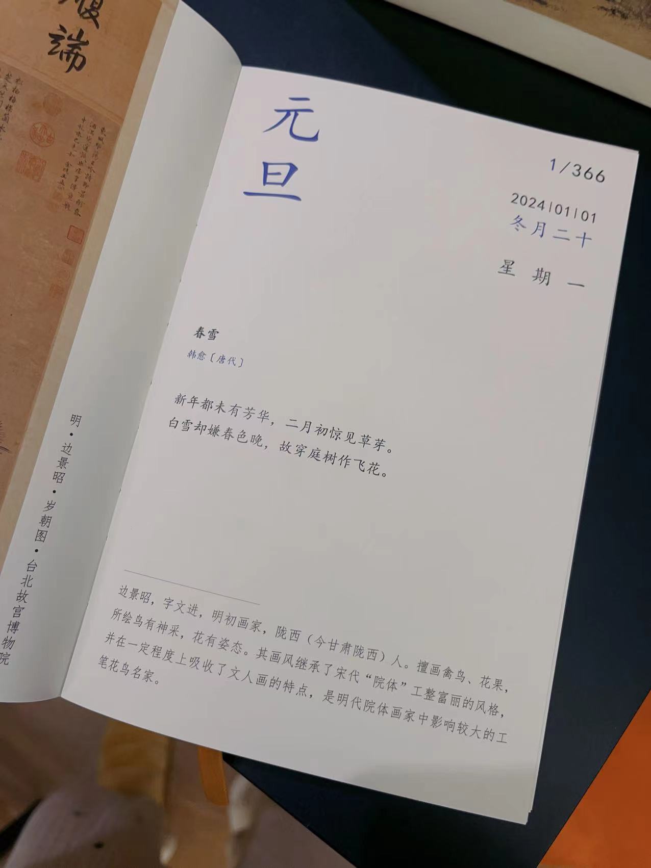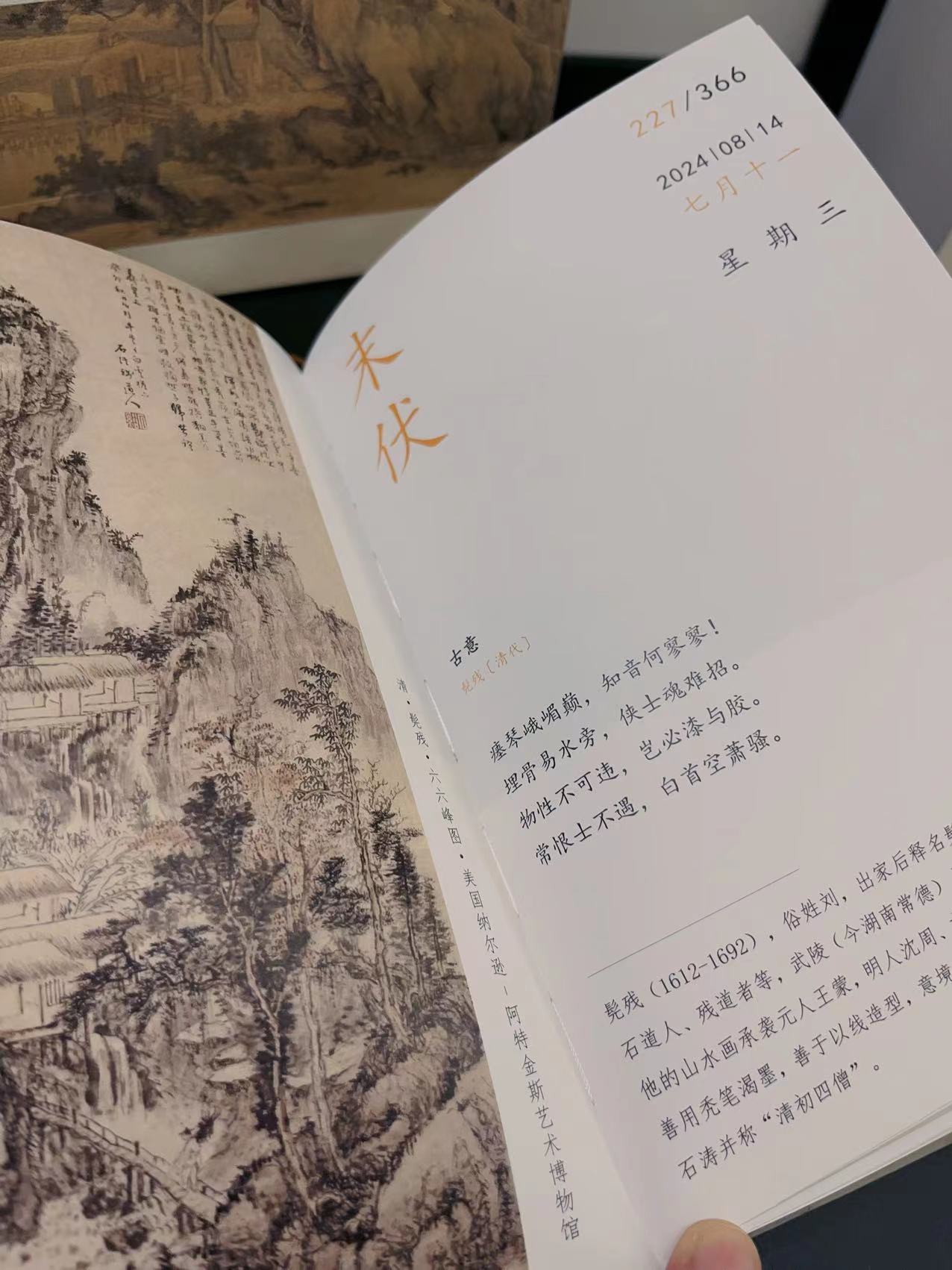 来自于祝唯艺术馆的设计,24年的这一本全部是取自于明清时代,一画一诗,画家的诗,诗人的画,结合的相当精致唯美。非常厚重的一本,内含超过450幅画,涵盖150余位明清书画家。美诗对应美画,每天可以花时间读一读,浸泡在中国古典文化的薰陶里,岂不美哉?