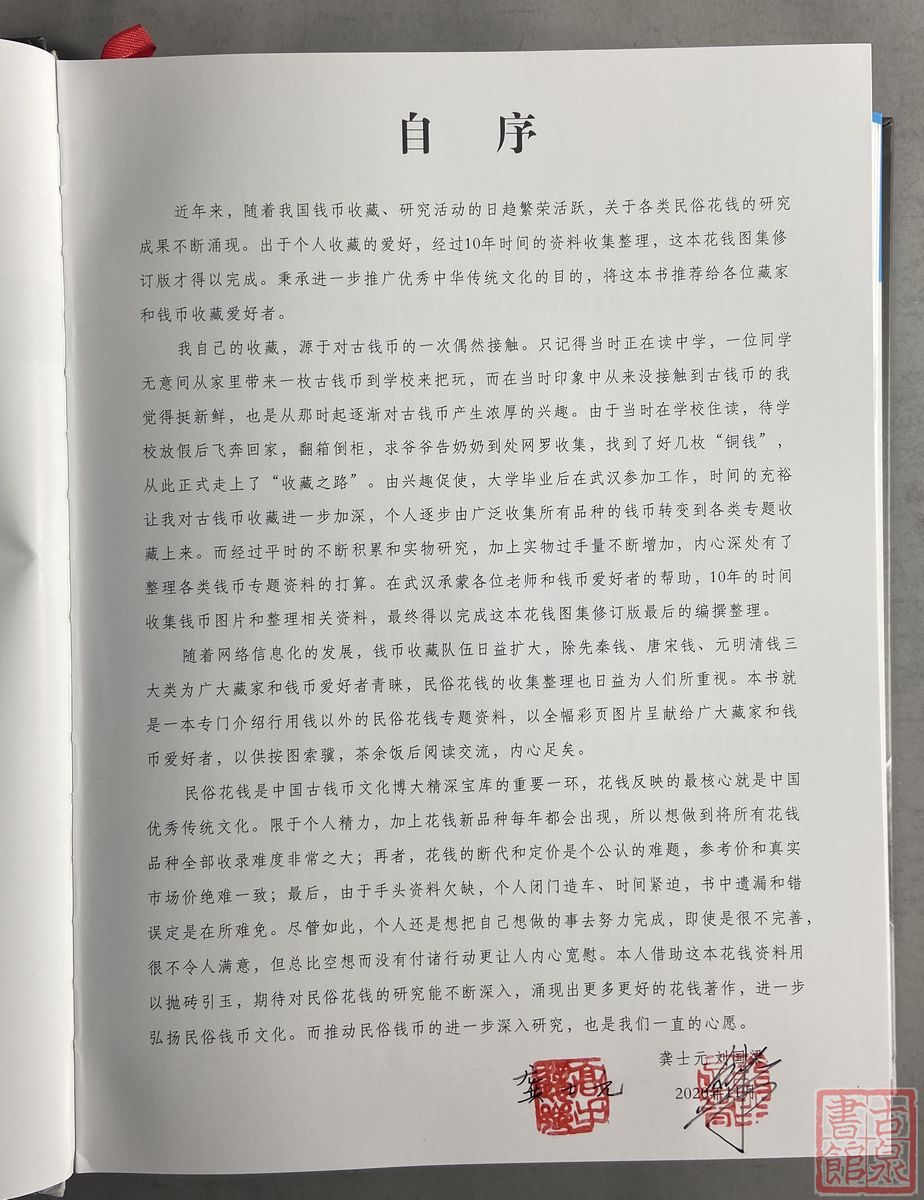 本次版本比2021版增加了36面,即由856面增加到892面,整书尽重达到7斤1两。我们不断努力,查漏补缺,不断修改并增加更多版别钱币图片,使得《中国花钱图集》知识更加全面,图片更加美观。每本均有作者龚士元、刘国梁两人签名,钤印。