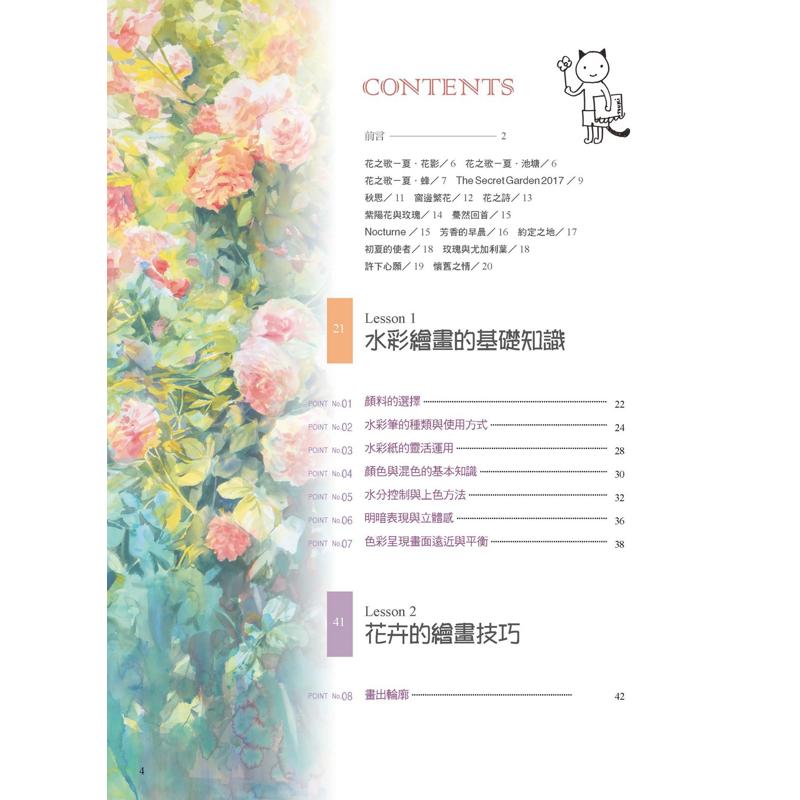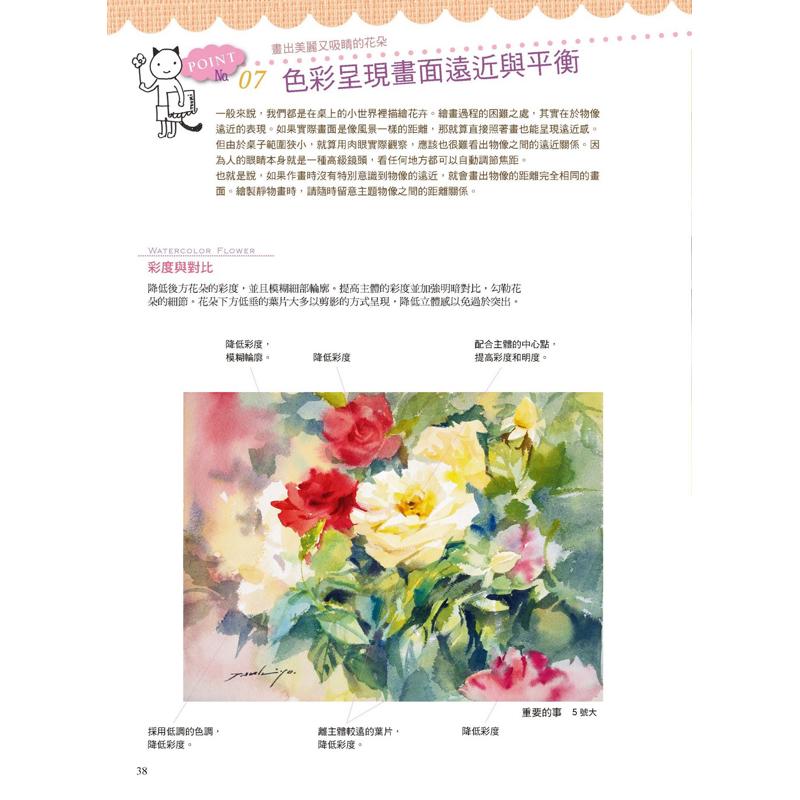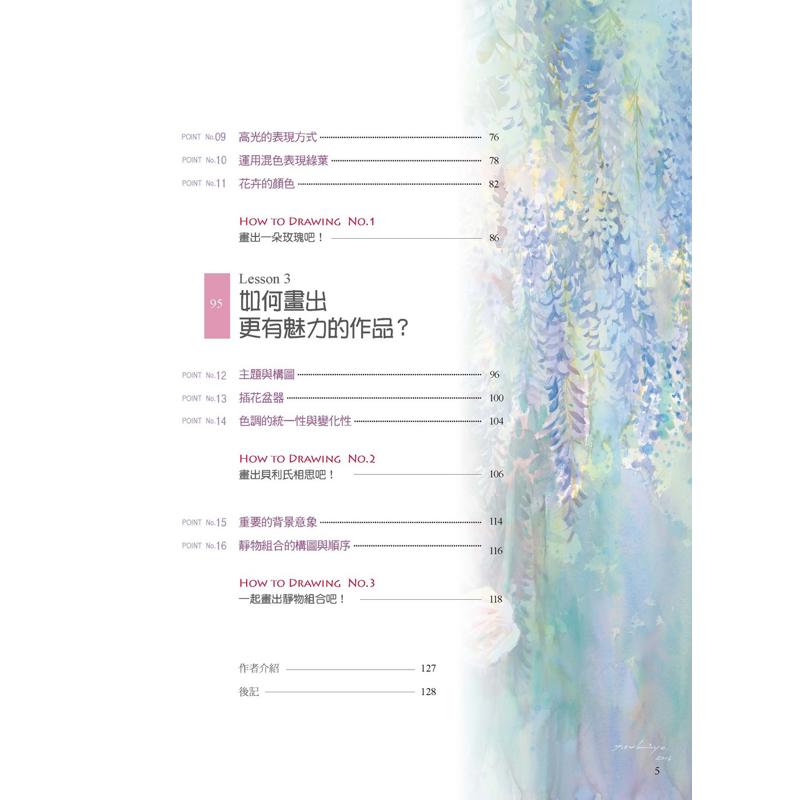 為了讓你體會更多水彩作畫的樂趣,我希望將自己對於繪畫的想法分享給你。不論是任何人都知道的簡易技巧,還是如寶物般重要的繪畫知識,都可能對你有所幫助!希望你能透過本書學習到各種花卉的水彩技法。