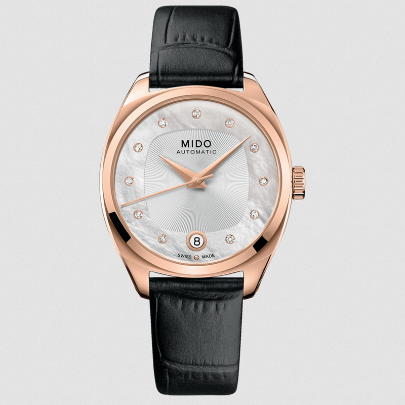 镜面 材质 | 蓝宝石水晶玻璃 | 表盘 | PVD镀玫瑰金不锈钢表壳 珍珠贝母表盘 指针 宝石时标 日期显示 透底 |
