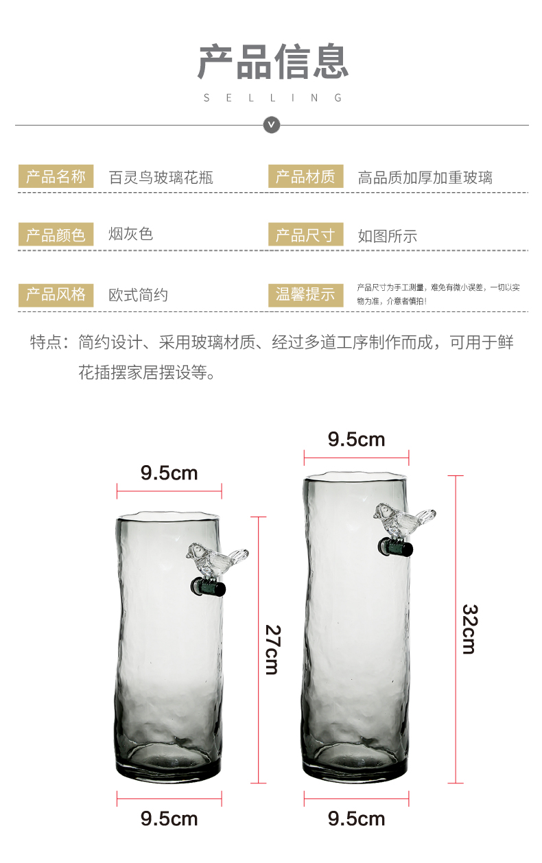 【温馨提示】这款花瓶属于人工吹制,气泡花瓶,瓶口边沿会有些不平整,少许花瓶表面会有凸起、小黑点等不属于质量问题,,玻璃制品有接缝/气泡/拉丝/凸点/针孔为正常现象,不影响美观,介意慎拍!