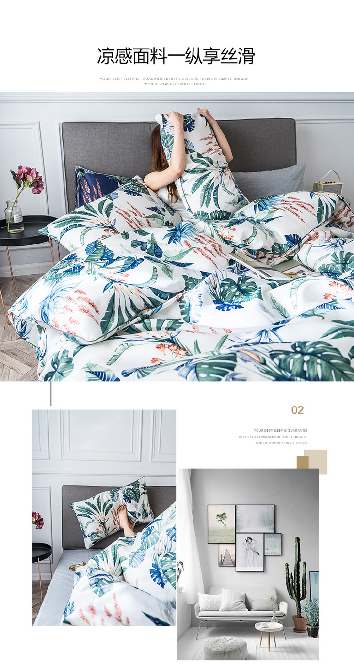 OKIOKI水洗臻丝四件套夏季冰丝欧式丝滑真丝床单被套夏凉床上 热带雨林-白 适合1.5-1.8床(被套200x230)