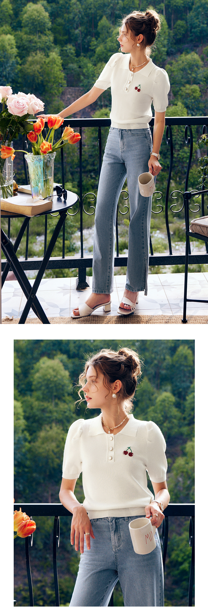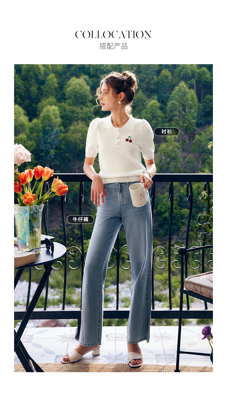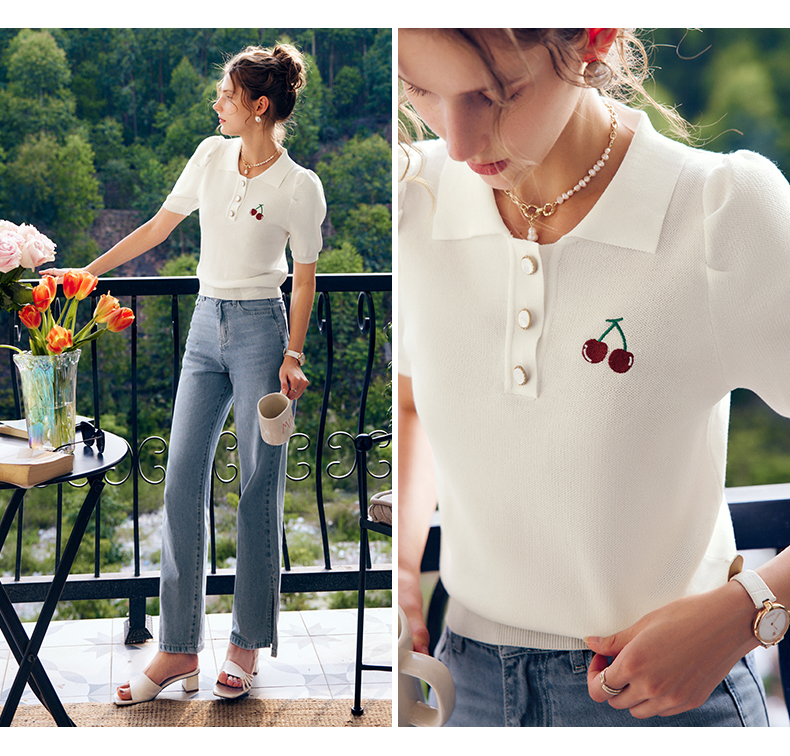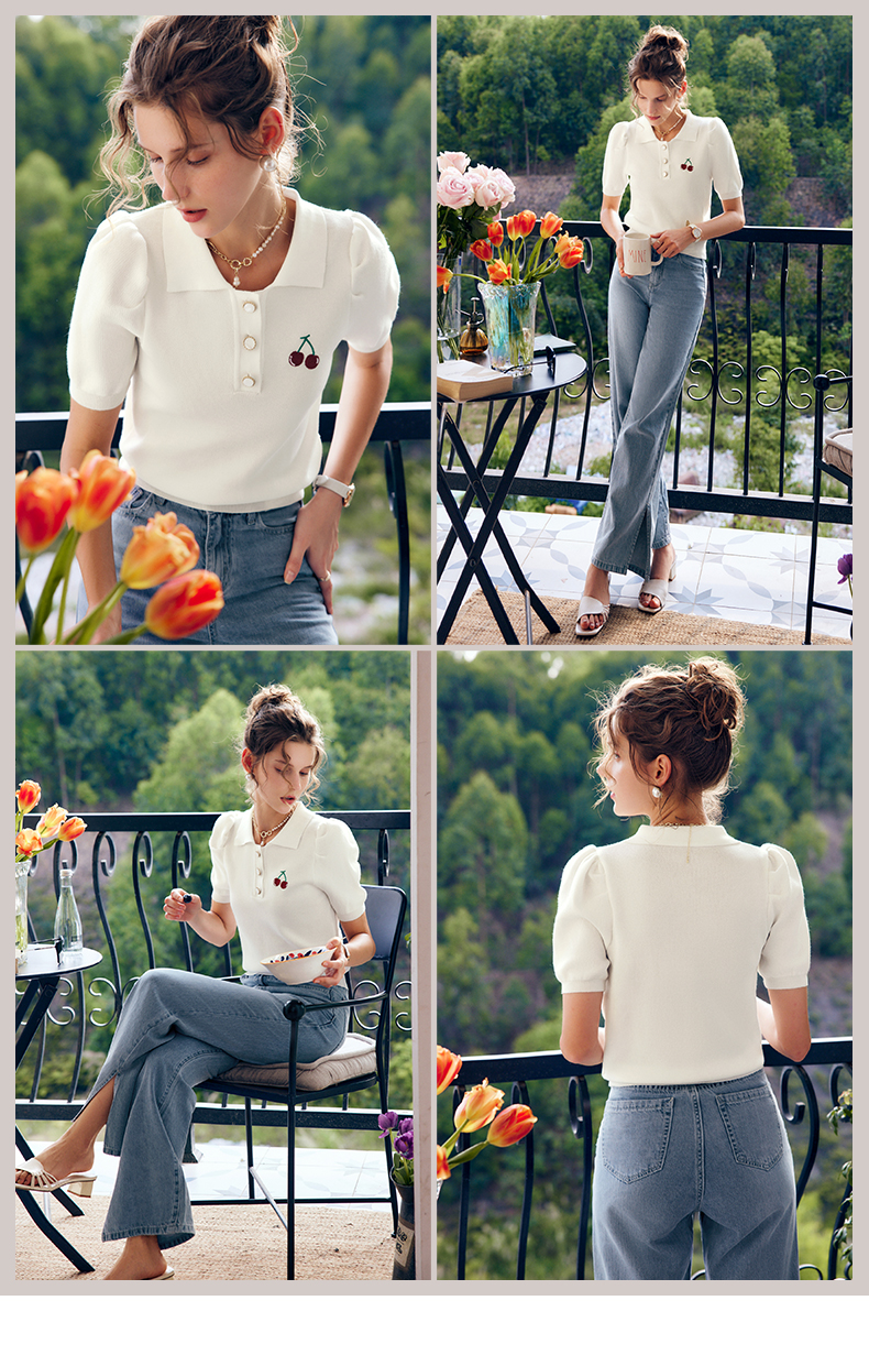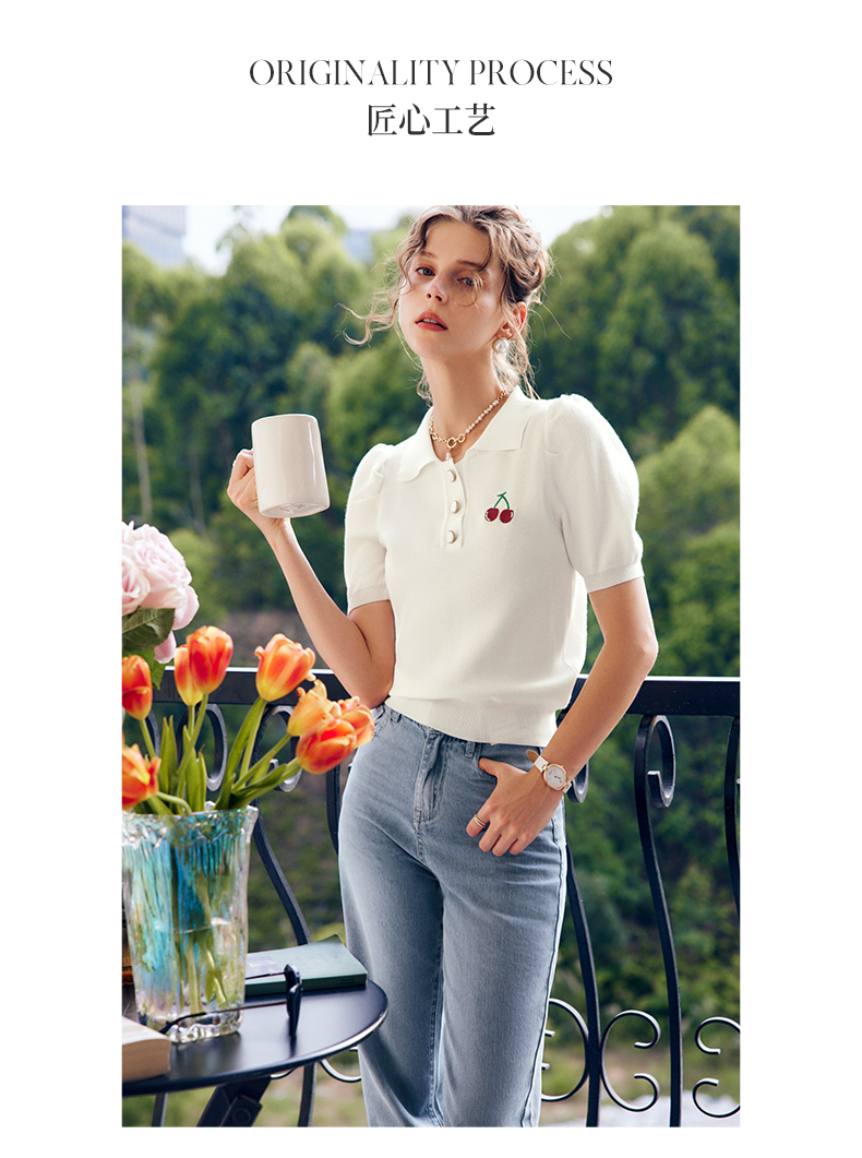 欧芮儿OLrain法式白色POLO领针织衫女夏季2022新款修身套头衫上衣
