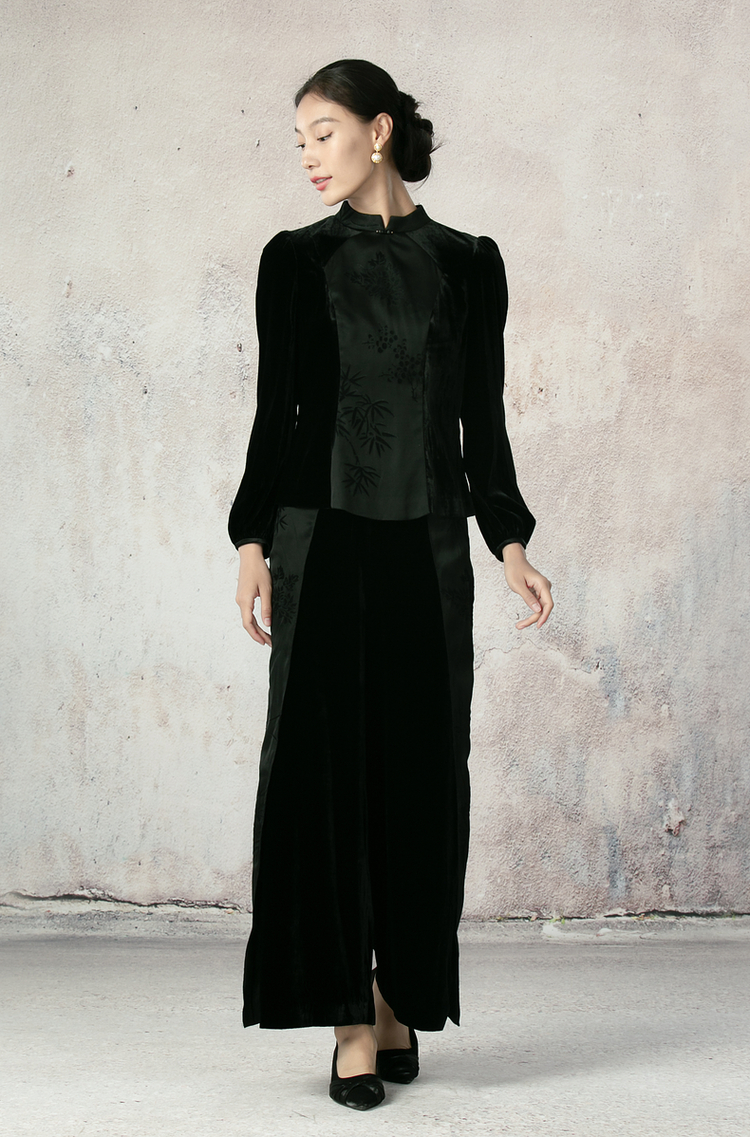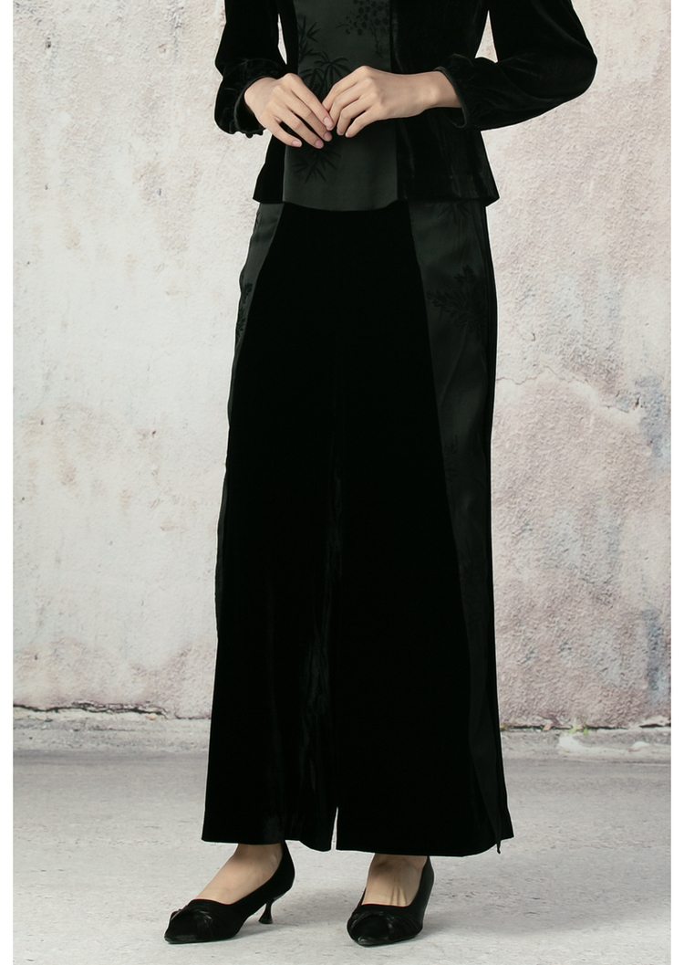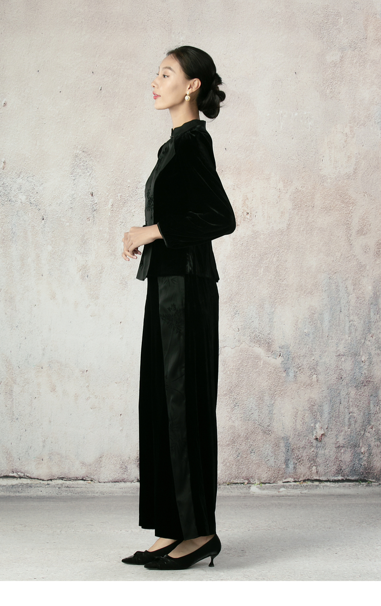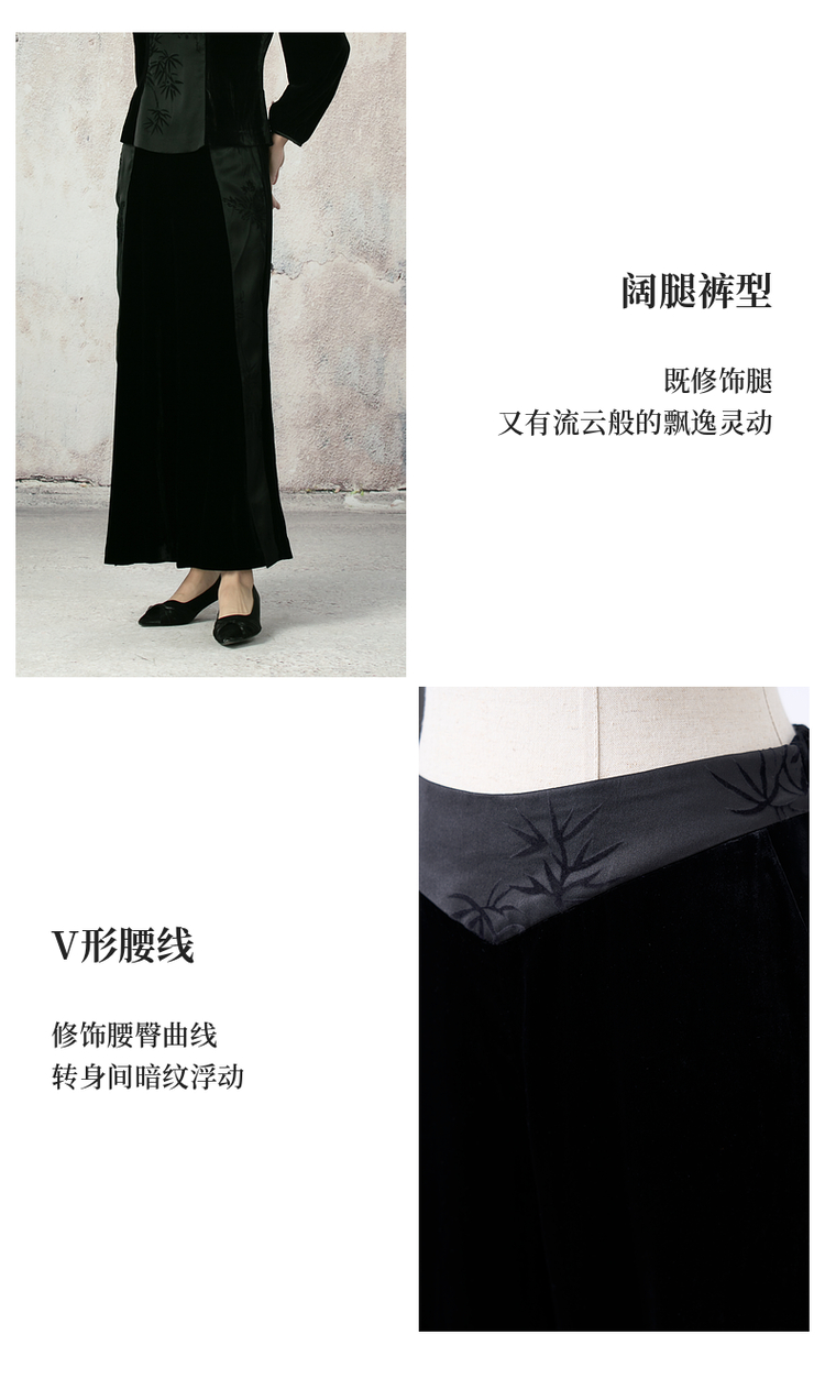 吉祥衣家新中式国风夏新款高端气质显瘦修身黑色女装寒雪未消裤子