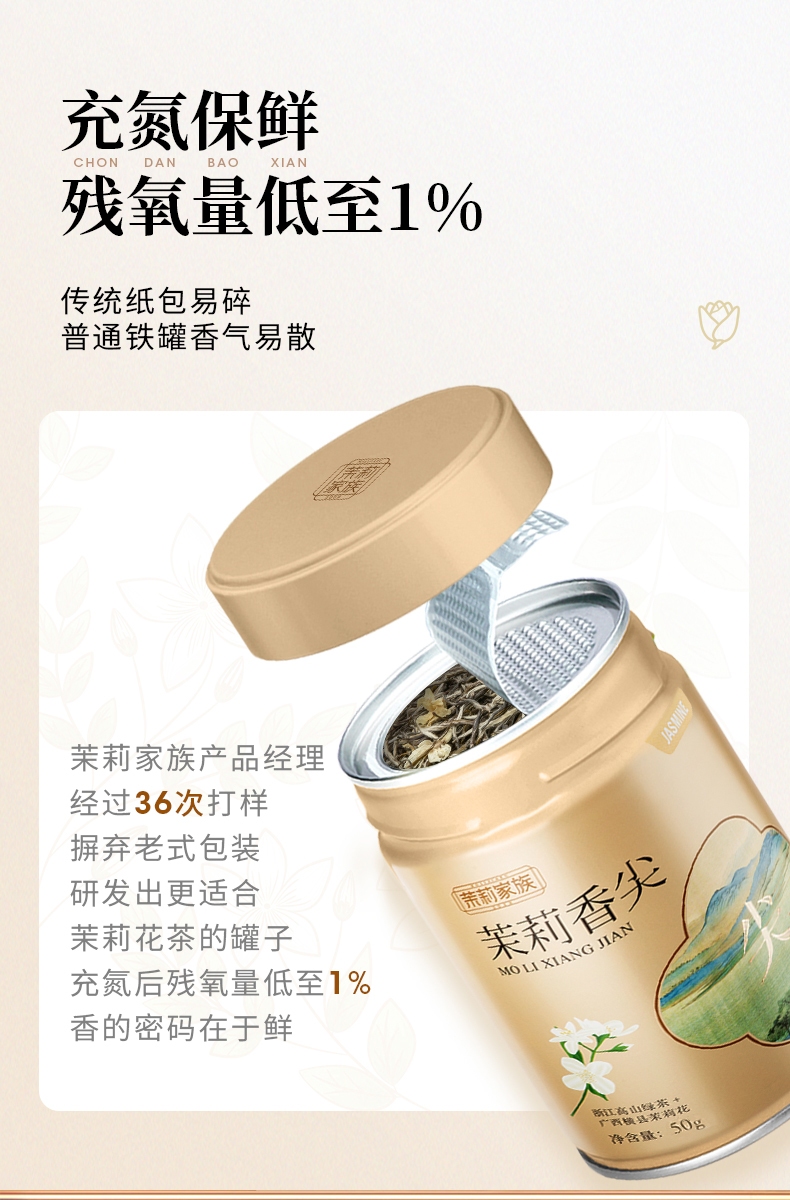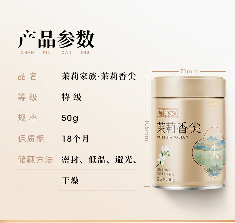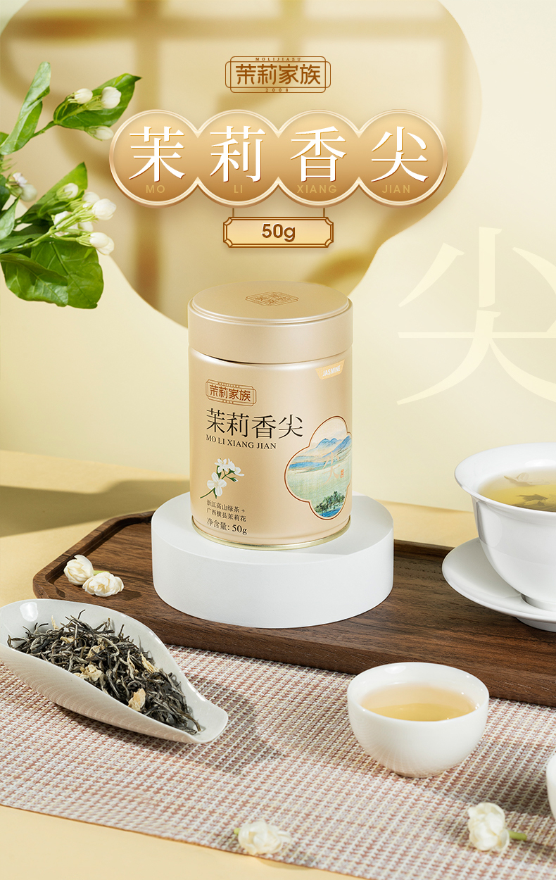 茉莉家族 茉莉香尖 细嫩多毫 新花新茶 特级浓香型绿茶 罐装