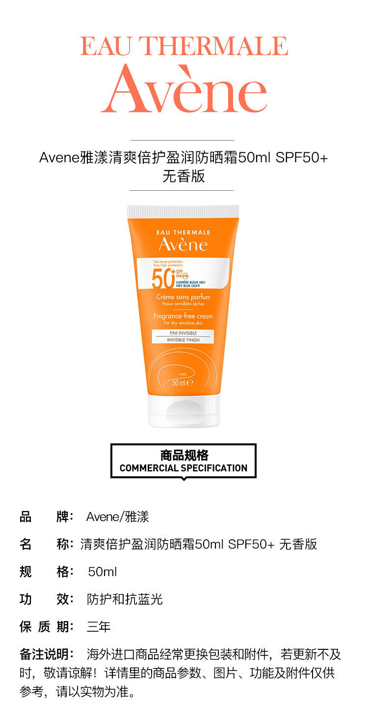 【预售 急单慎拍】Avene雅漾清爽倍护盈润防晒霜50ml SPF50+ 无香版