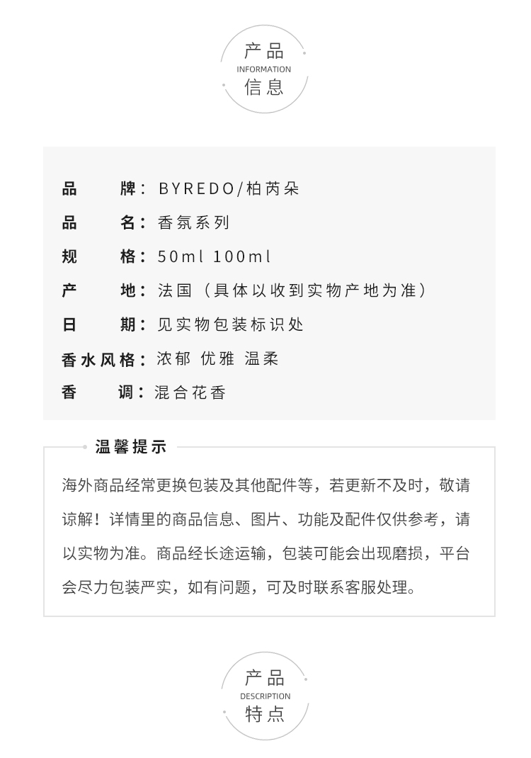 Byredo百瑞德无人区玫瑰/超级雪松/荒漠孤魂/白色浪漫 女士香水50/100ml【CDF】