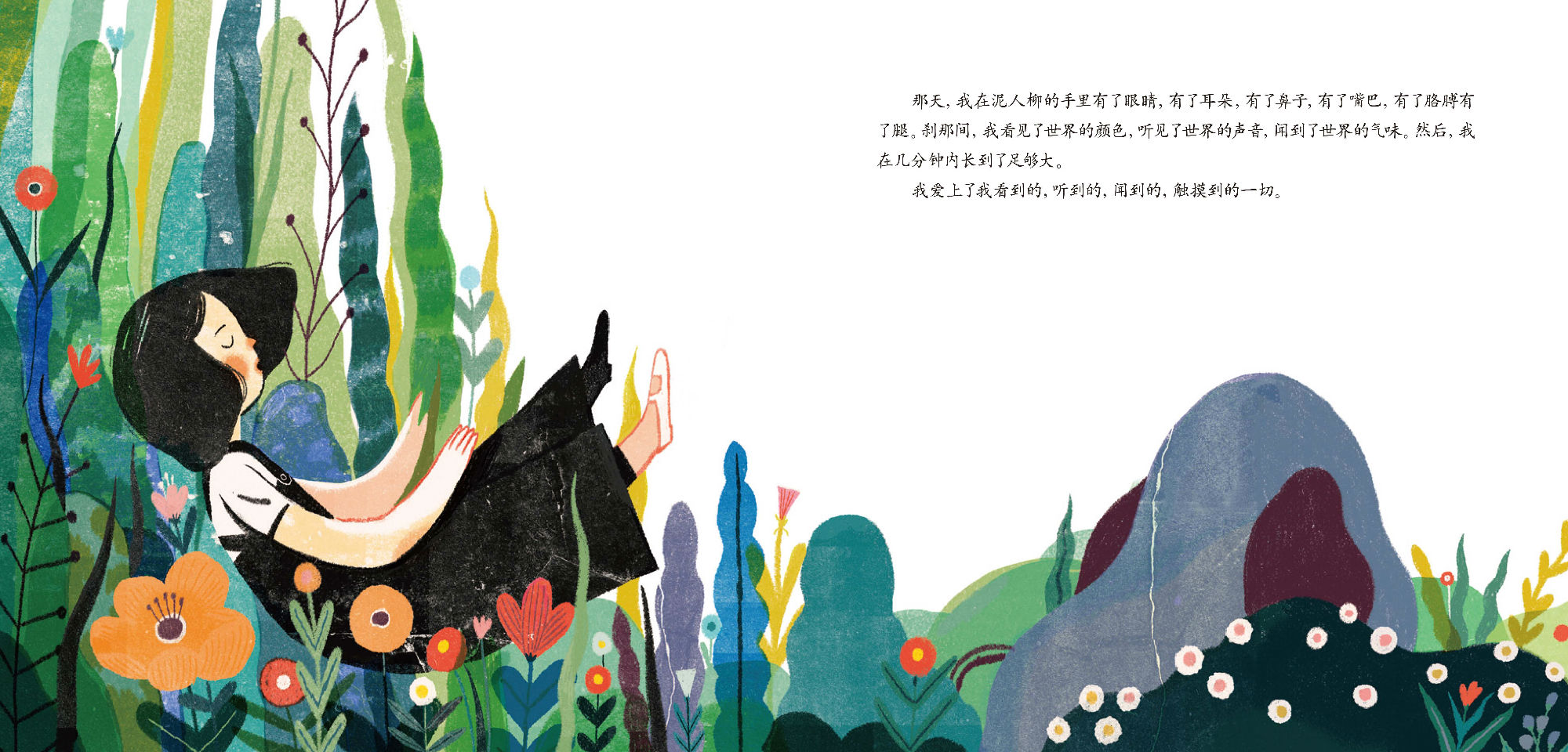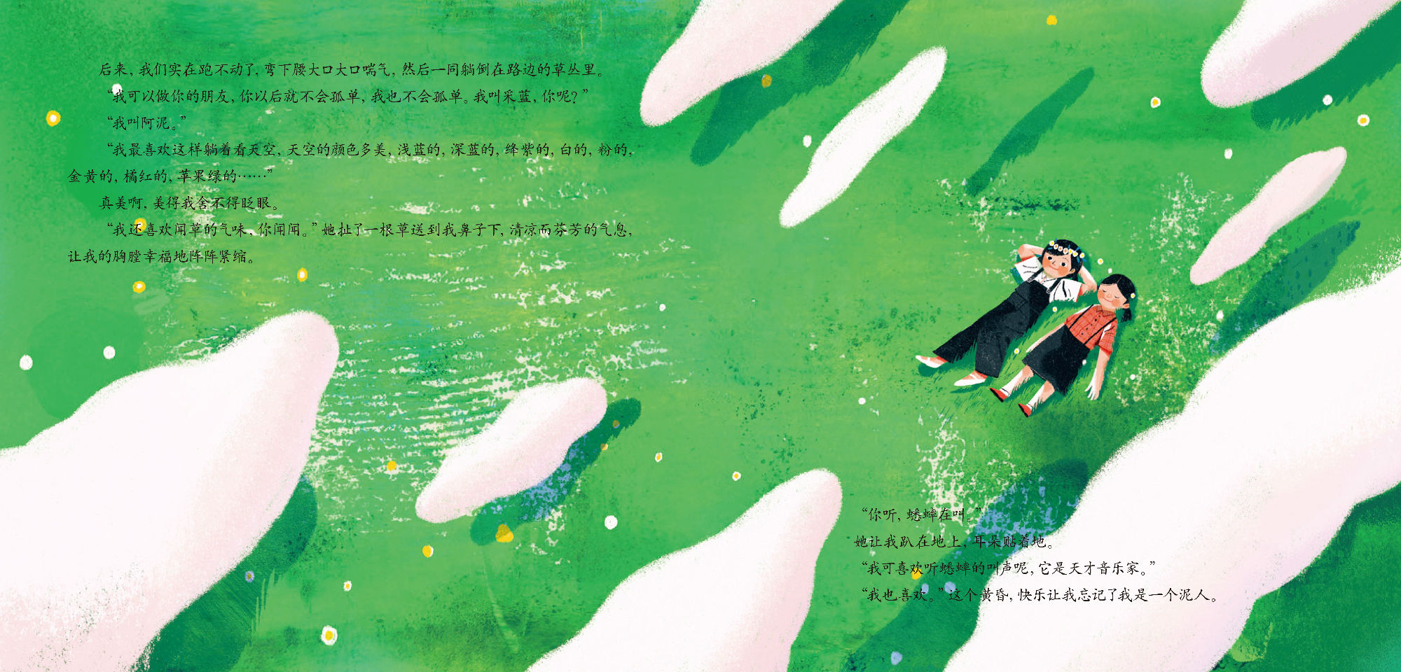 绘制这本书时,我内心里真的感觉得到阿泥迫切的想法,虽然和幼年的我出发点不同,成为“别人”的过程,实际上也是在找到自己,成为自己,我们并没有真的取代别人的想法。所以,我把阿泥画成了我小时候的模样,我让采蓝穿着我读小学时穿过的校服,把一些我童年的秘密偷偷藏在了两个女孩身上。阿泥和采蓝在其中奔跑的花花草草的世界,也是我小时候梦想中的世界,那个小小的我,曾经那么喜欢收集小小的花,喜欢建造只有我一个人的世界,喜欢拥有秘密。