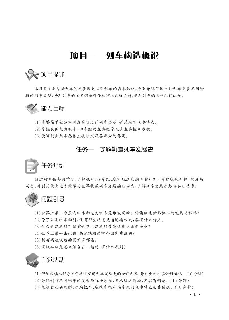 本书为国家“双高计划”铁道机车专业群融合课程特色系列教材之一,包括《列车构造认知与检查》《列车构造认知与检查活页实训手册》两部分,其中《列车构造认知与检查》从列车构造概论、轨道列车车体、列车车辆设备、走行部认知与检查、列车车钩缓冲装置、列车风源及管路系统六个项目进行知识讲述;《列车构造认知与检查活页实训手册》通过十个具体的学习情境,从学习情境描述、学习目标、任务书、任务分组、引导问题、任务实施、任务评价七个方面出发,完成相应实训任务。