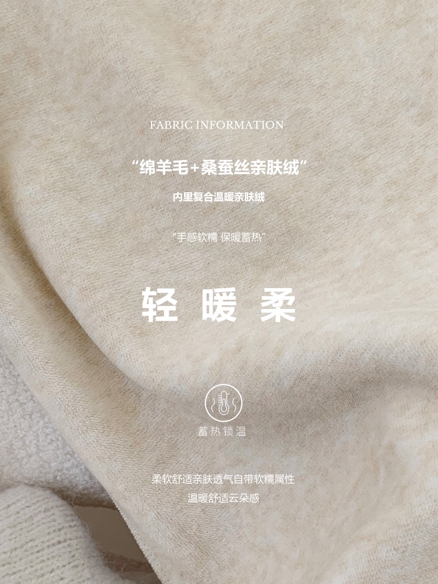 绵软细腻的“羊毛蚕丝”内里, 绒感柔软亲肤 保暖性极佳 可以温暖呵护整个冬天