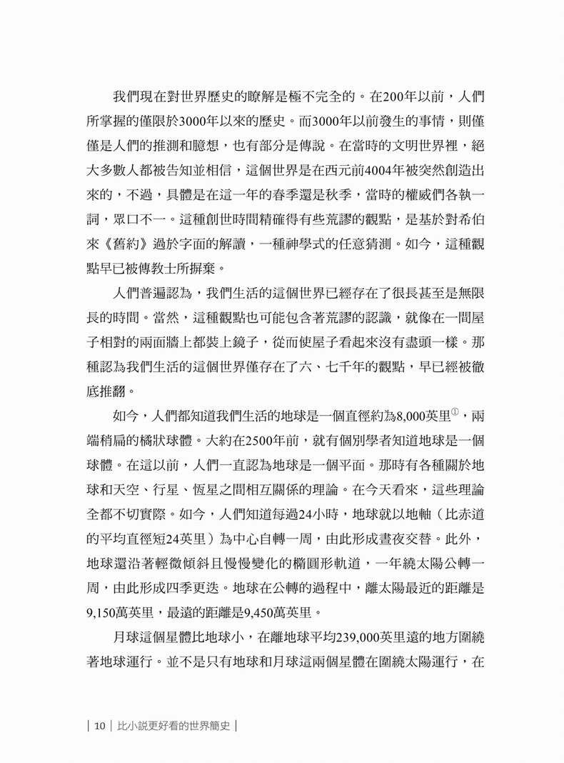 我寫作這部《世界簡史》的*大願望,是希望讀者能像讀小說一樣,一口氣把它讀完。為此,我在書中省去了那些繁瑣的事件,以一種簡潔明瞭的寫法,把我們現今所知道的歷史講述出來。——赫伯特.喬治.威爾斯