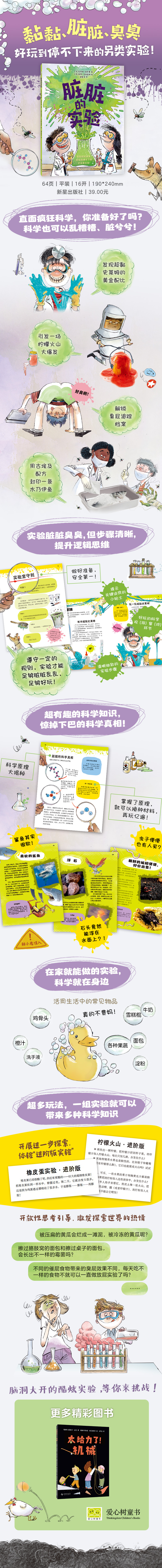 科学不是枯燥乏味的——它充满了好奇心、乐趣和想象力!这本书中有16组酷炫、疯狂、脏脏的科学实验,孩子们可以亲身体验如何制作两种不同类型的史莱姆,如何取下生鸡蛋的壳而不打破它,如何将肥皂变成两倍大,如何制作出一座喷射的火山等等。每组实验后还附有与实验相关的小科普知识,展示这些实验在现实中有哪些相关的事物或现象——当然这些小科普同样脏脏臭臭,包括臭鼬、蓝纹奶酪,还有你的屁。插图夸张而生动、实验简单而古怪,孩子在家中就可以尽情尝试,特别适合不怕弄得双手脏兮兮、不怕挑战怪味的小小科学家!