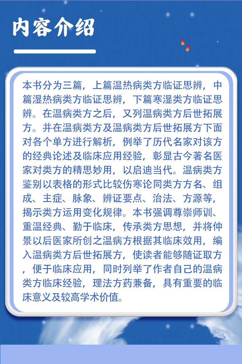本书分为三篇,上篇温热病类方临证思辨,中篇湿热病类方临证思辨,下篇寒湿类方临证思辨。在温病类方之后,又列温病类方后世拓展方。并在温病类方及温病类方后世拓展方下面对各个单方进行解析,例举了历代名家对该方的经典论述及临床应用经验,彰显古今著名医家对类方的精思妙用,以启迪当代。温病类方鉴别以表格的形式比较伤寒论同类方方名、组成、主症、脉象、辨证要点、治法、方源等,揭示类方运用变化规律。本书强调尊崇师训、重温经典、勤于临床,传承类方思想,并将仲景以后医家所创之温病方根据其临床效用,编入温病类方后世拓展方,使读者能够随证取方,便于临床应用,同时列举了作者自己的温病类方临床经验,理法方药兼备,具有重要的临床意义及较高学术价值。