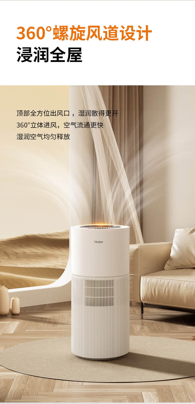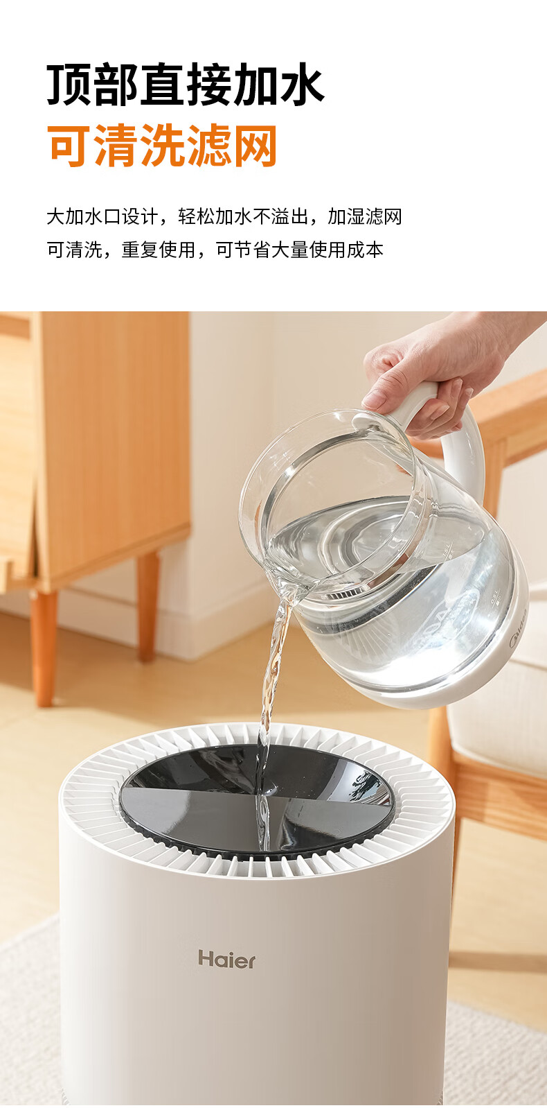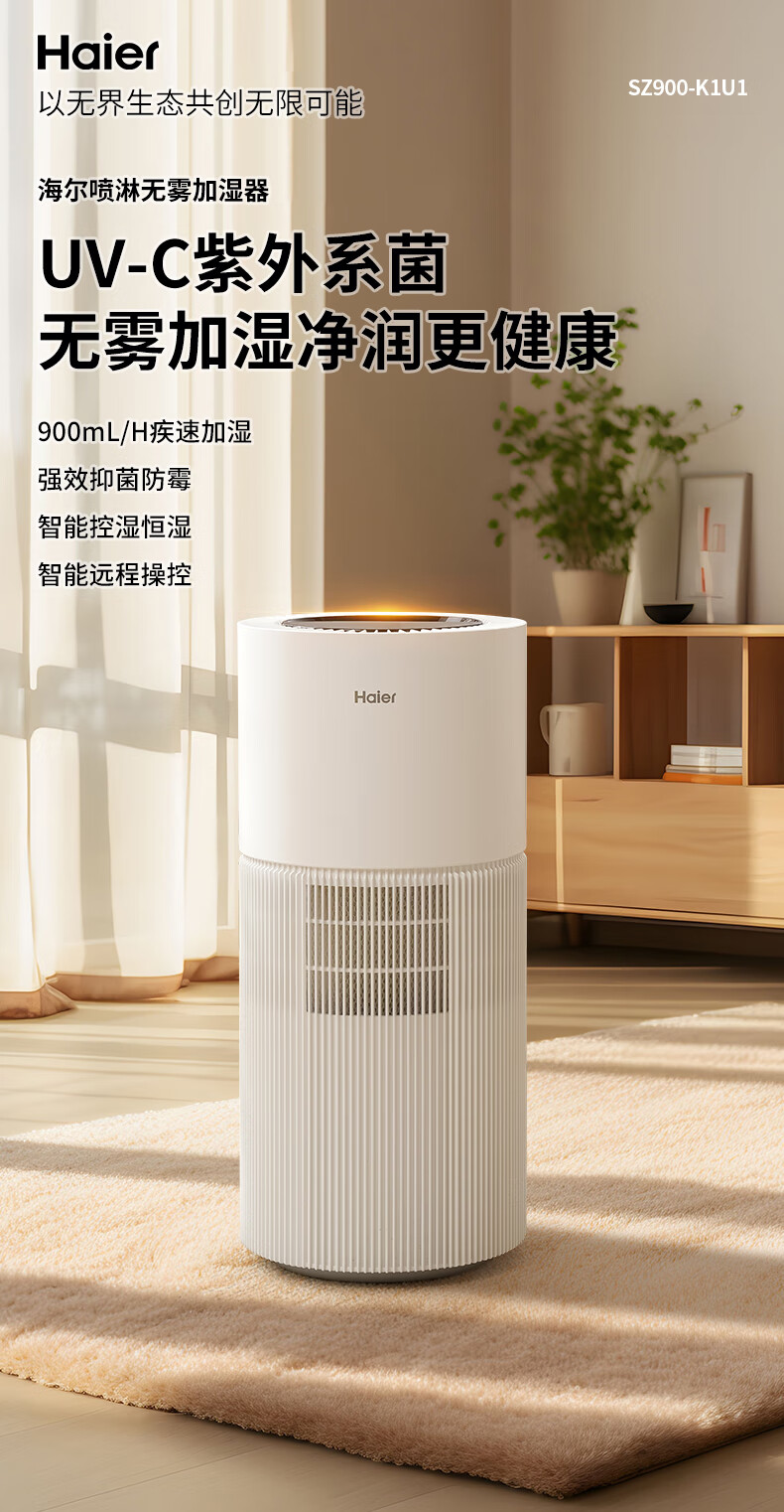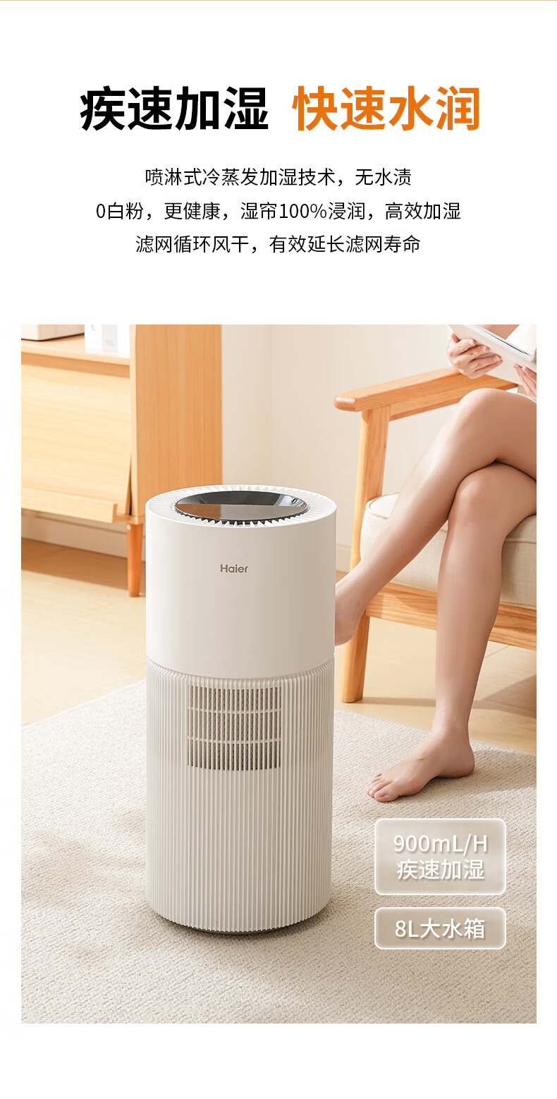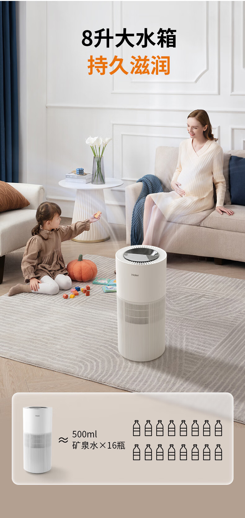 海尔(Haier)无雾加湿器家用落地式 轻音卧室办公室客厅大面积母婴级 900ml/h快速加湿 8L大水箱 紫外线除菌 喷淋式空气加湿器