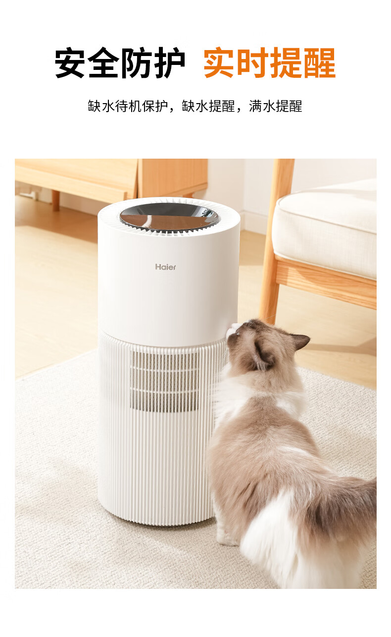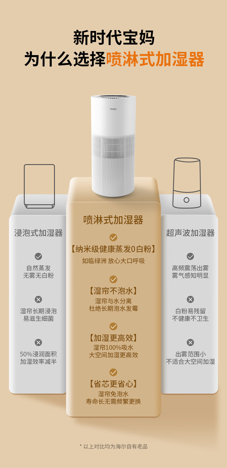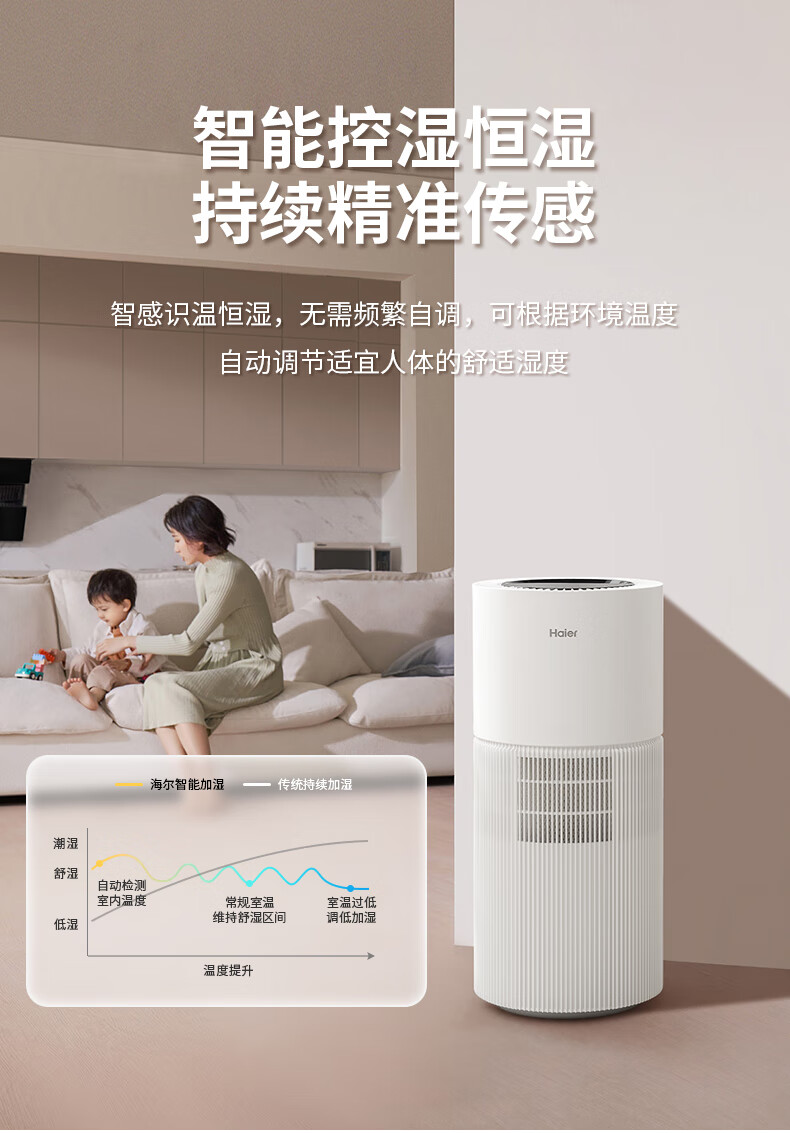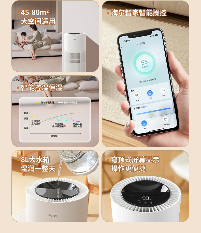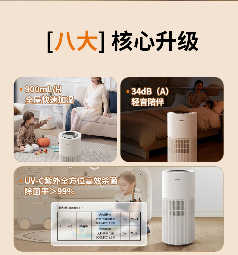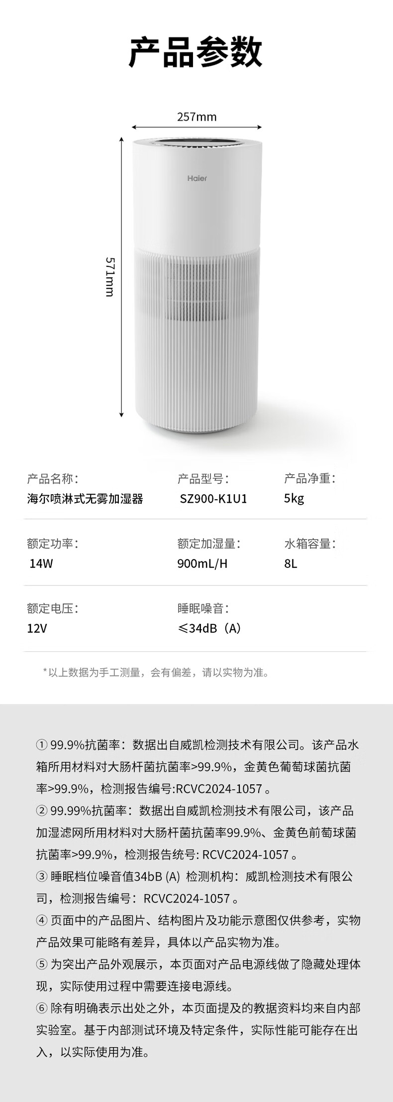 海尔(Haier)无雾加湿器家用落地式 轻音卧室办公室客厅大面积母婴级 900ml/h快速加湿 8L大水箱 紫外线除菌 喷淋式空气加湿器