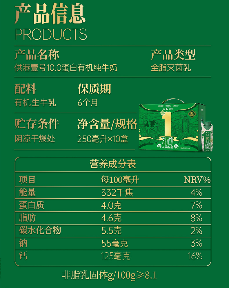 【快递包邮】供港壹号10.0蛋白有机纯牛奶250ml*10梦幻盖包装