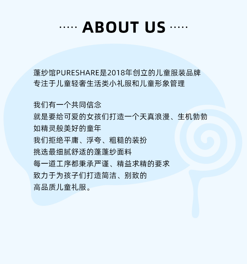 PureShare蓬纱馆,2018年创立的儿童服装品牌,专注于儿童轻奢生活类小礼服,主张“让孩子做最独特的自己”的品牌理念,为孩子们提供时尚简洁、优雅而又不失童真的生活类礼服。