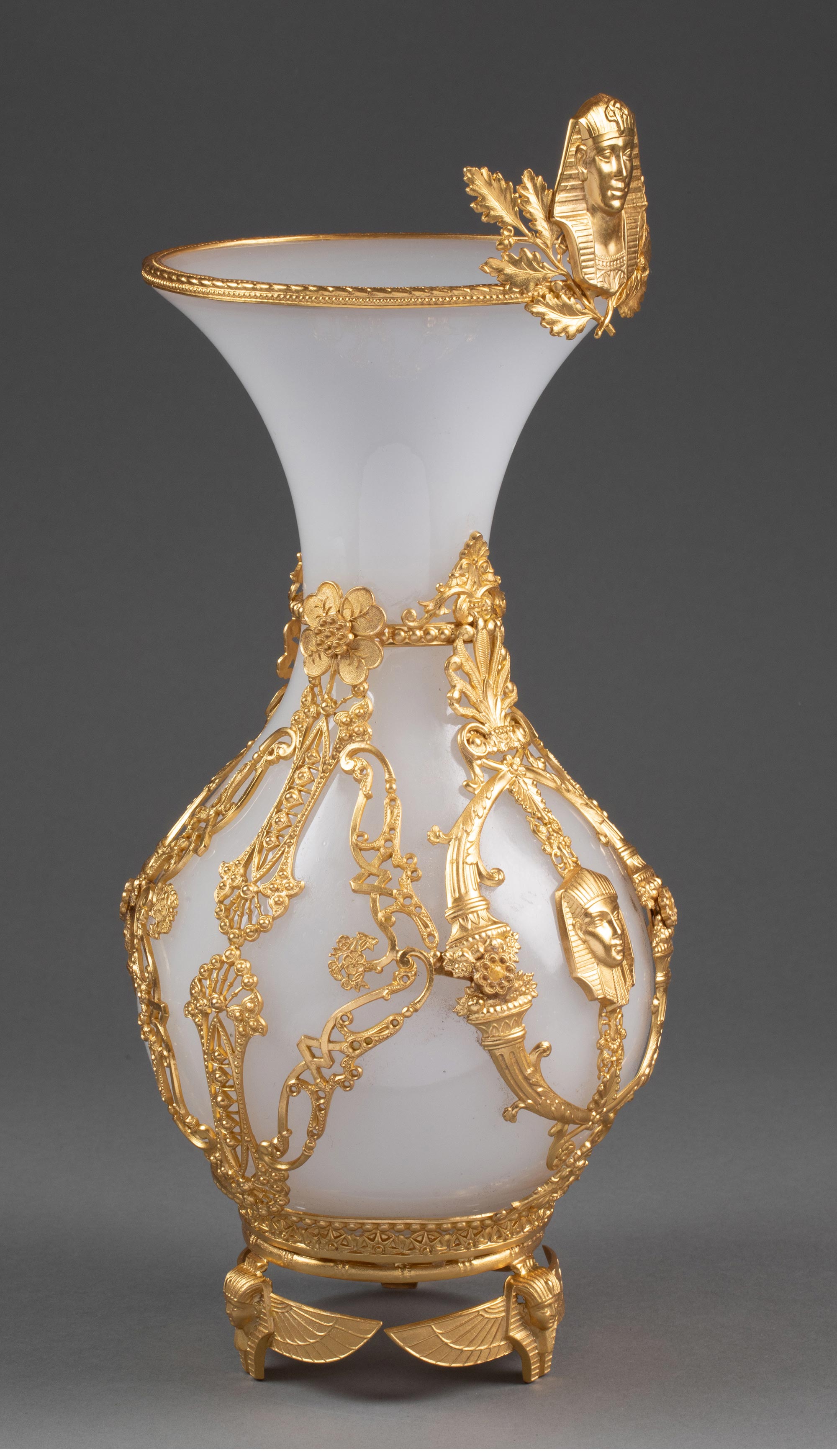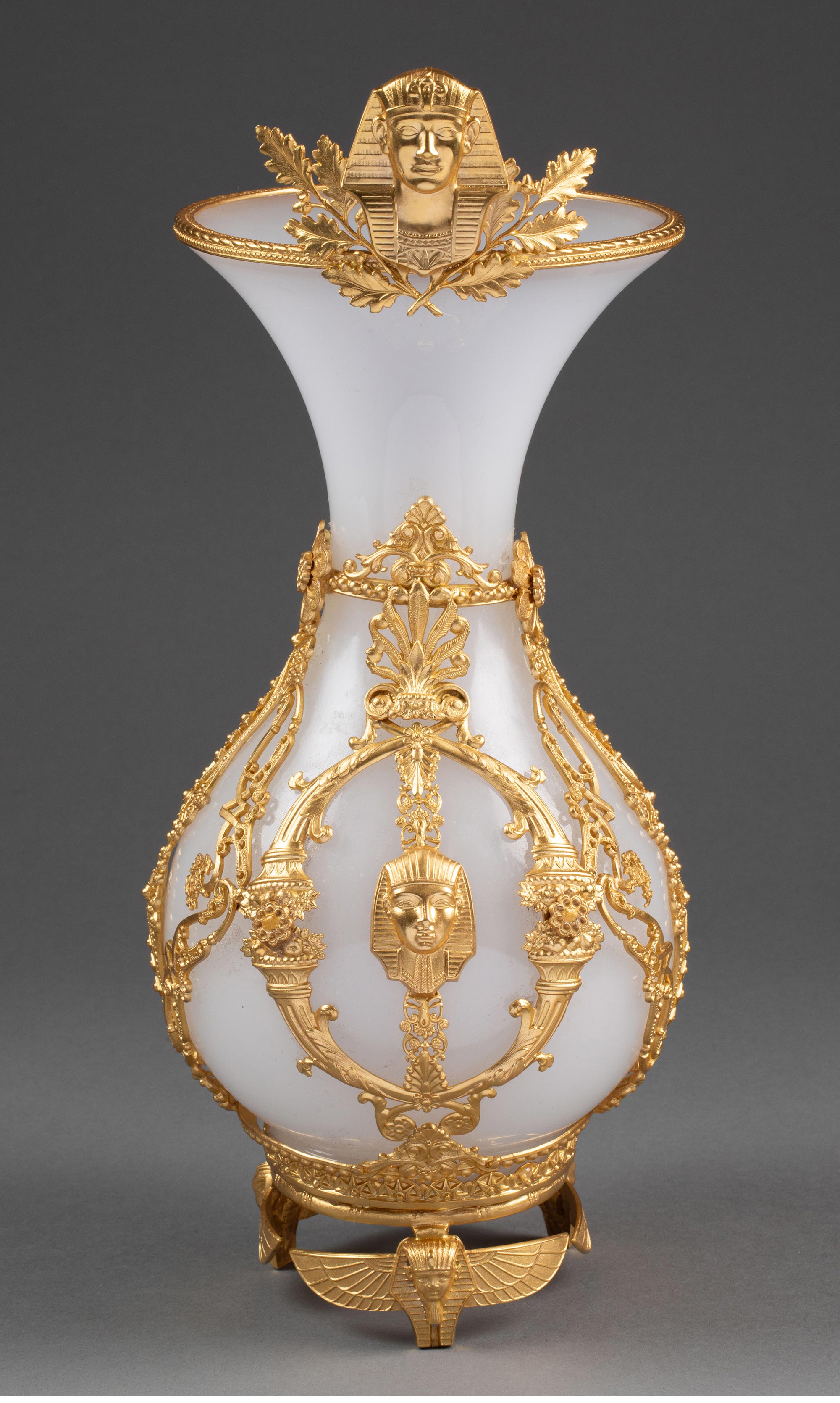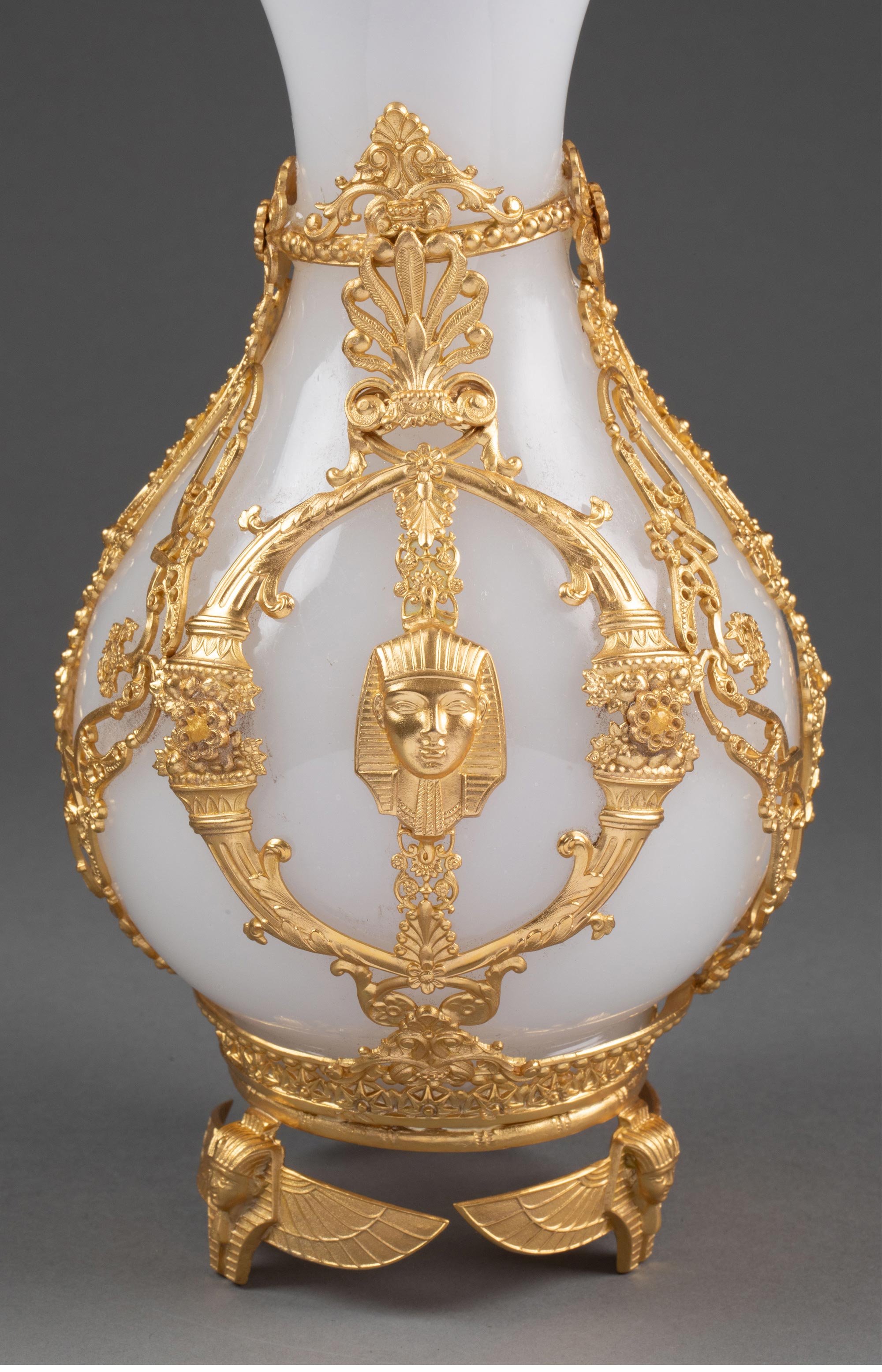 19世纪末法国出品古埃及人物主题铜鎏金精雕装饰白色欧泊水晶花瓶