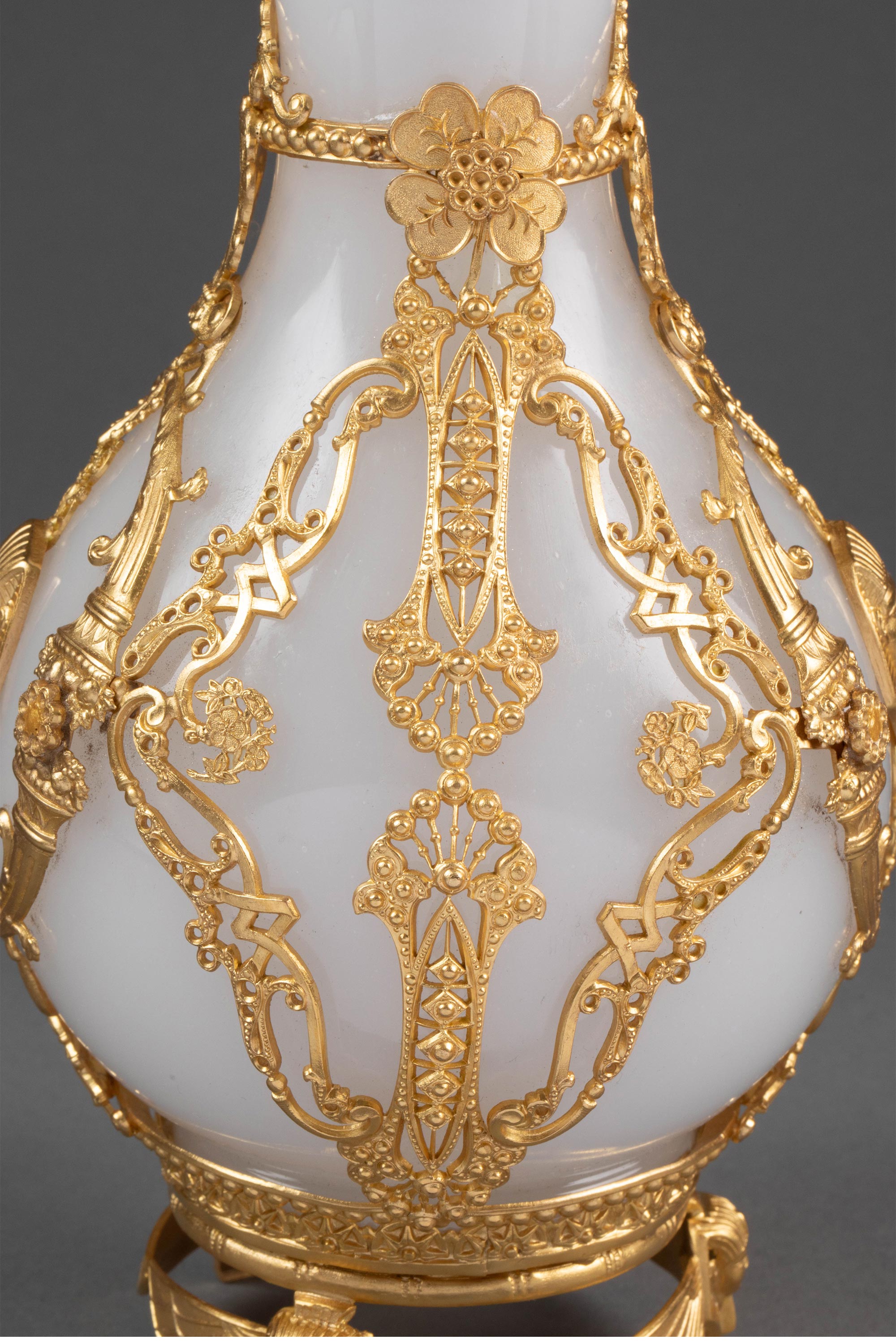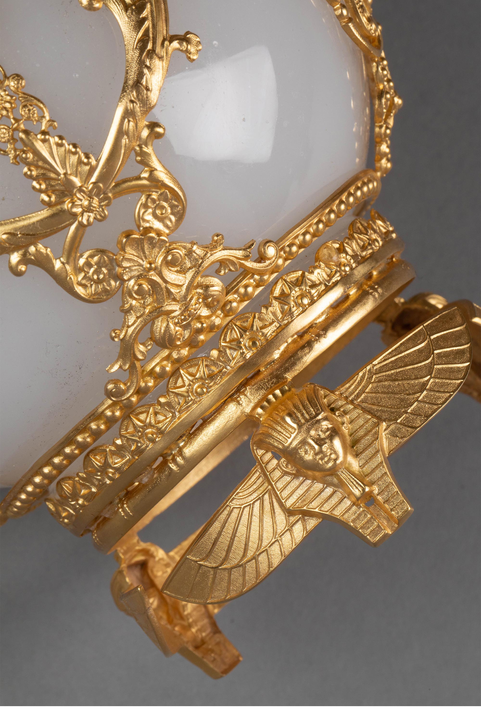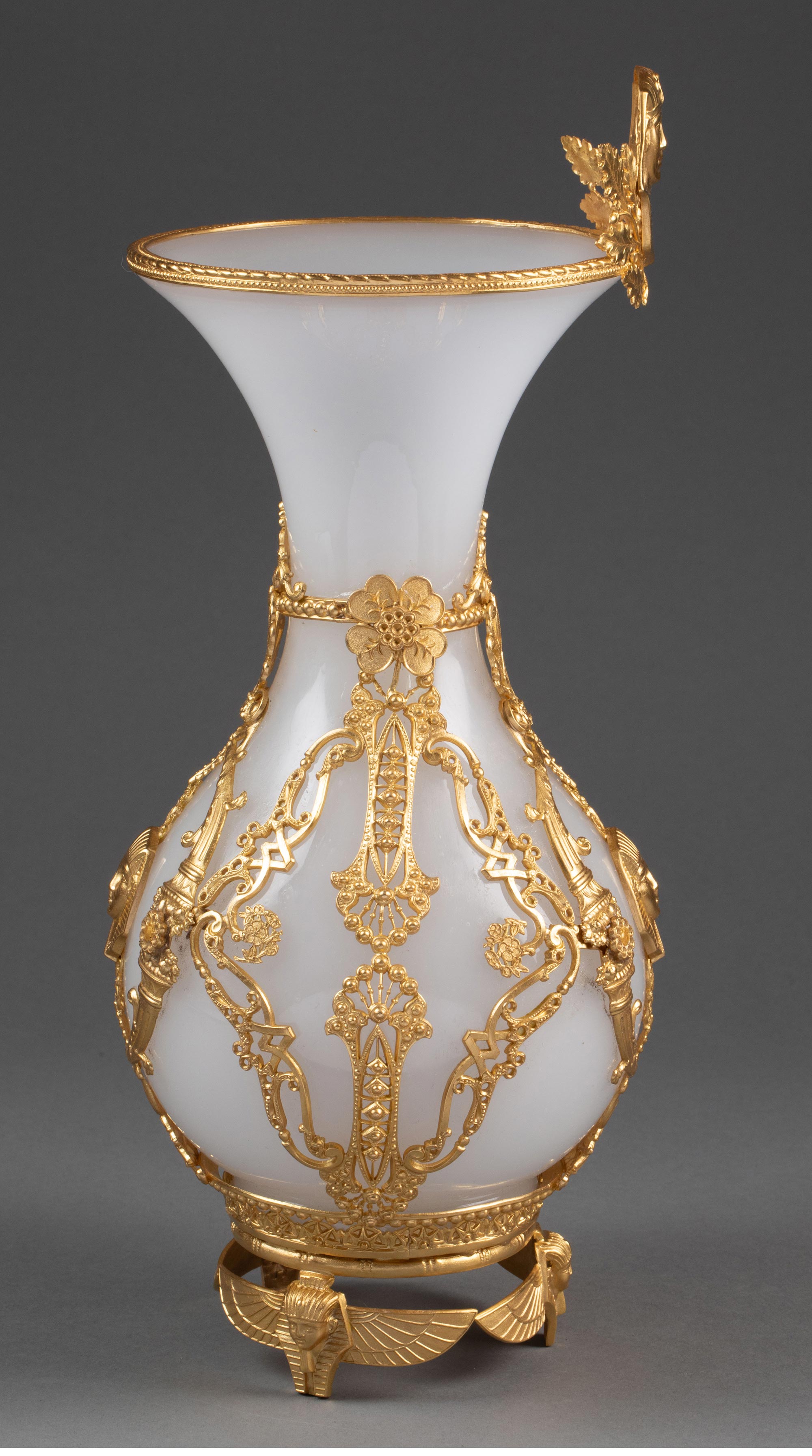 19世纪末法国出品古埃及人物主题铜鎏金精雕装饰白色欧泊水晶花瓶