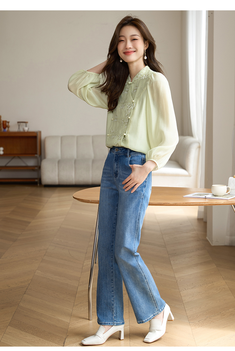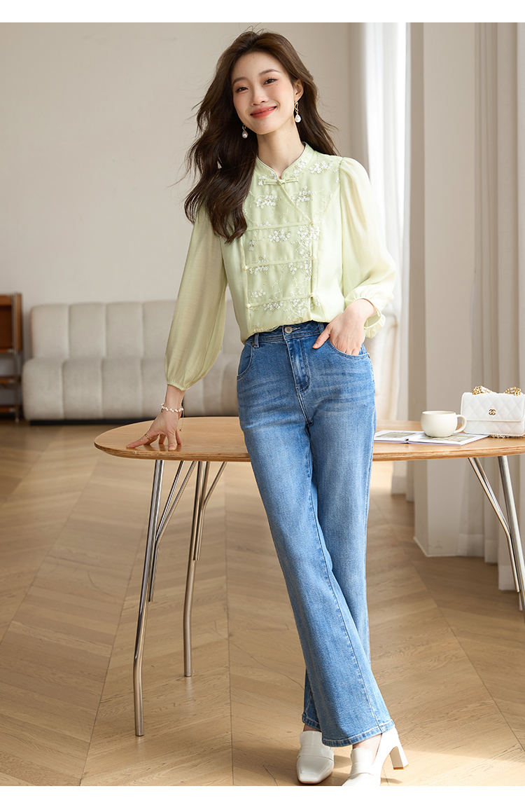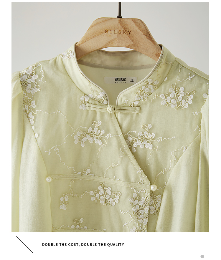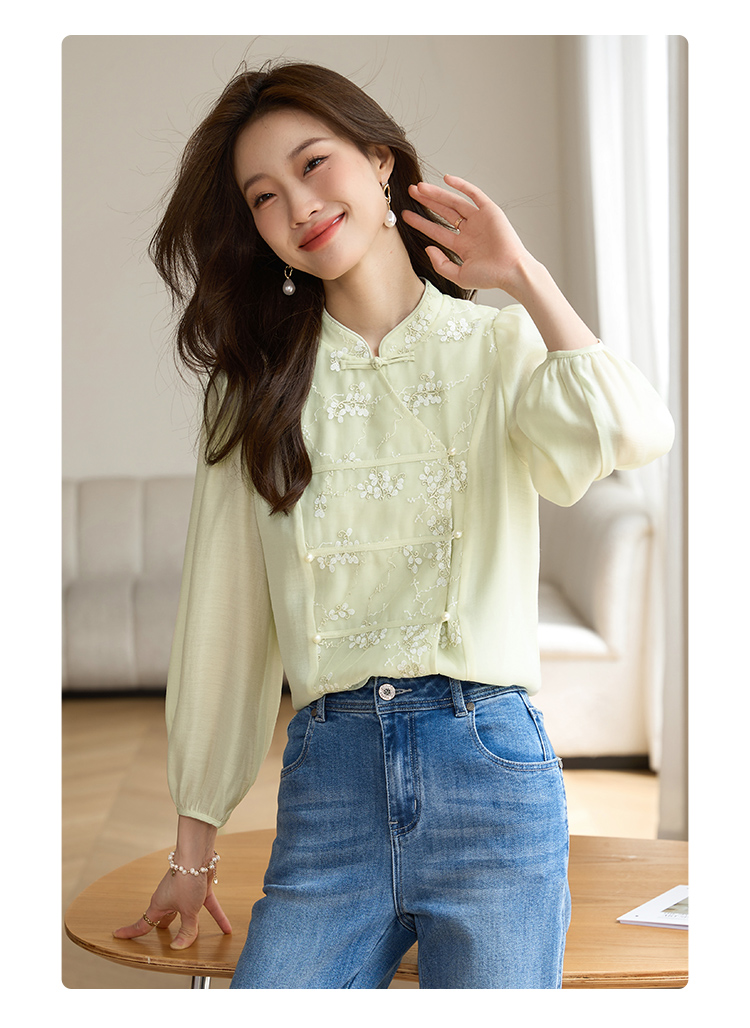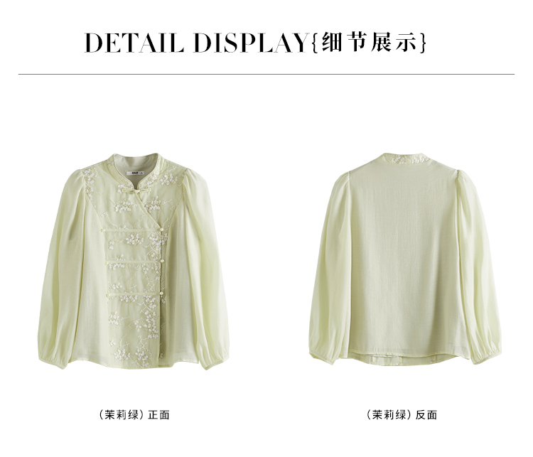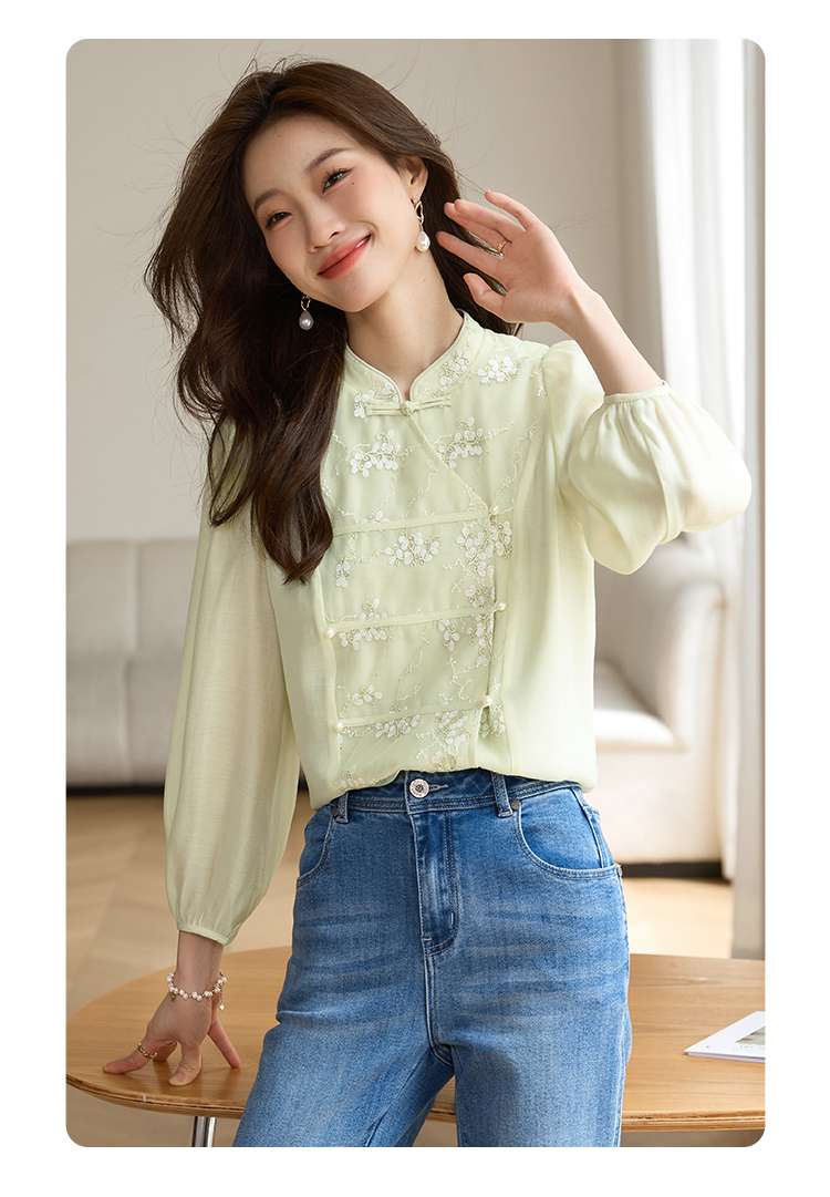 【1件72折】熙世界新中式国风刺绣盘扣衬衫女秋季新款气质灯笼袖立领天丝上衣