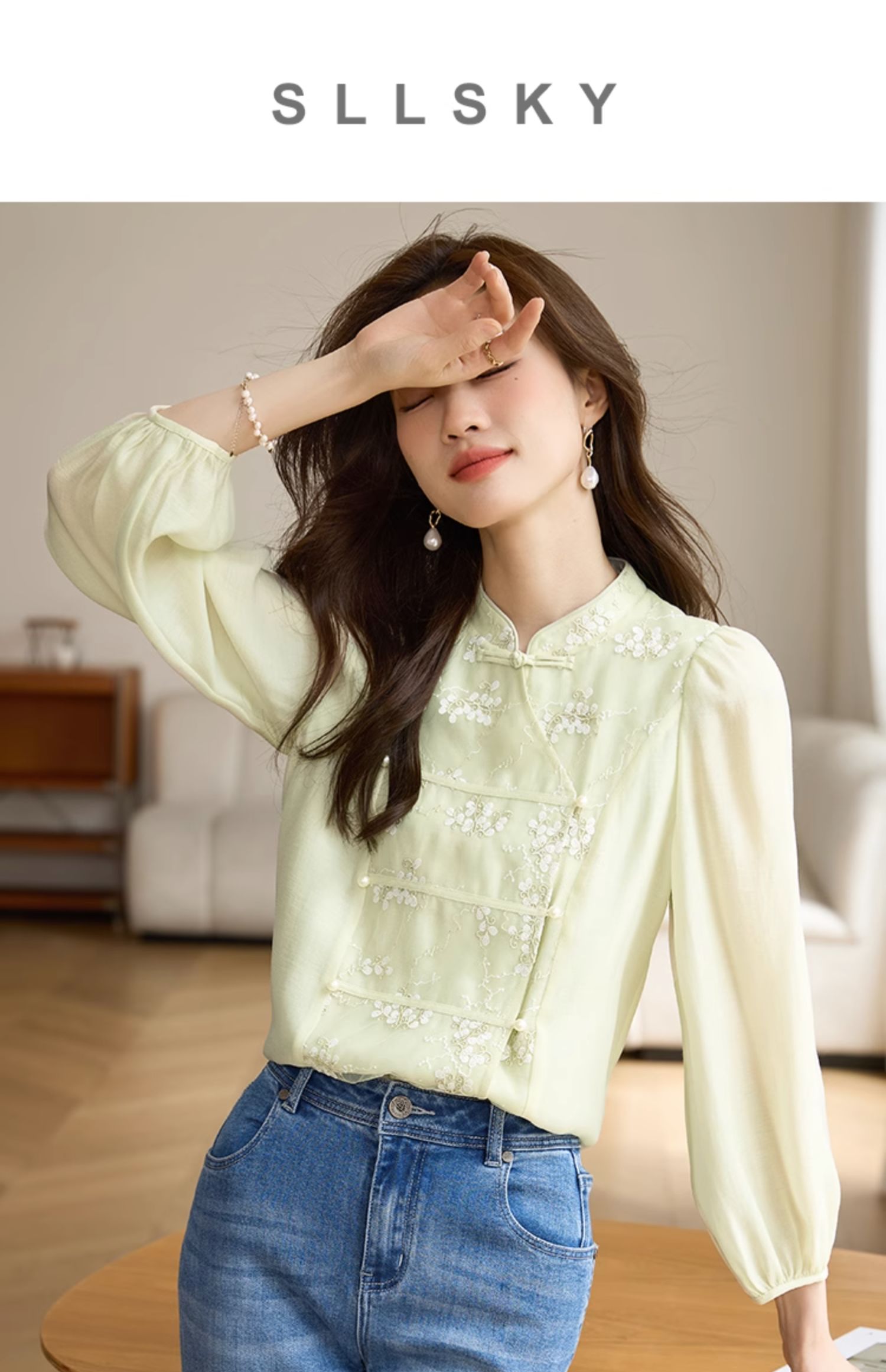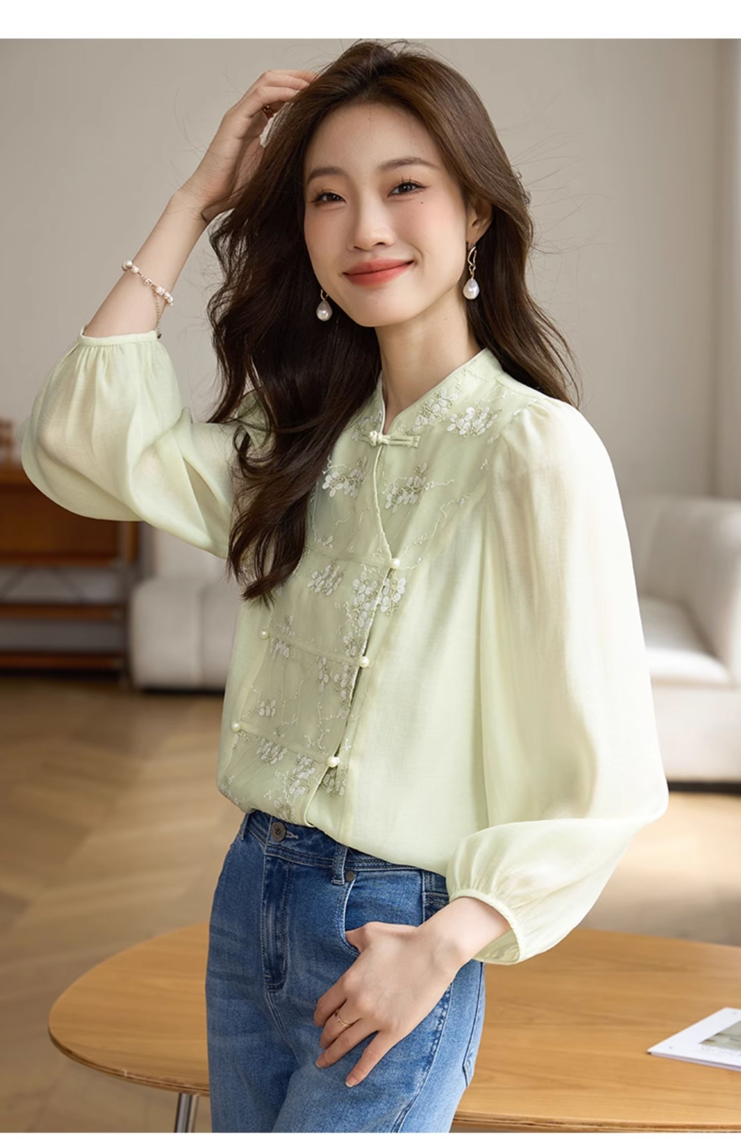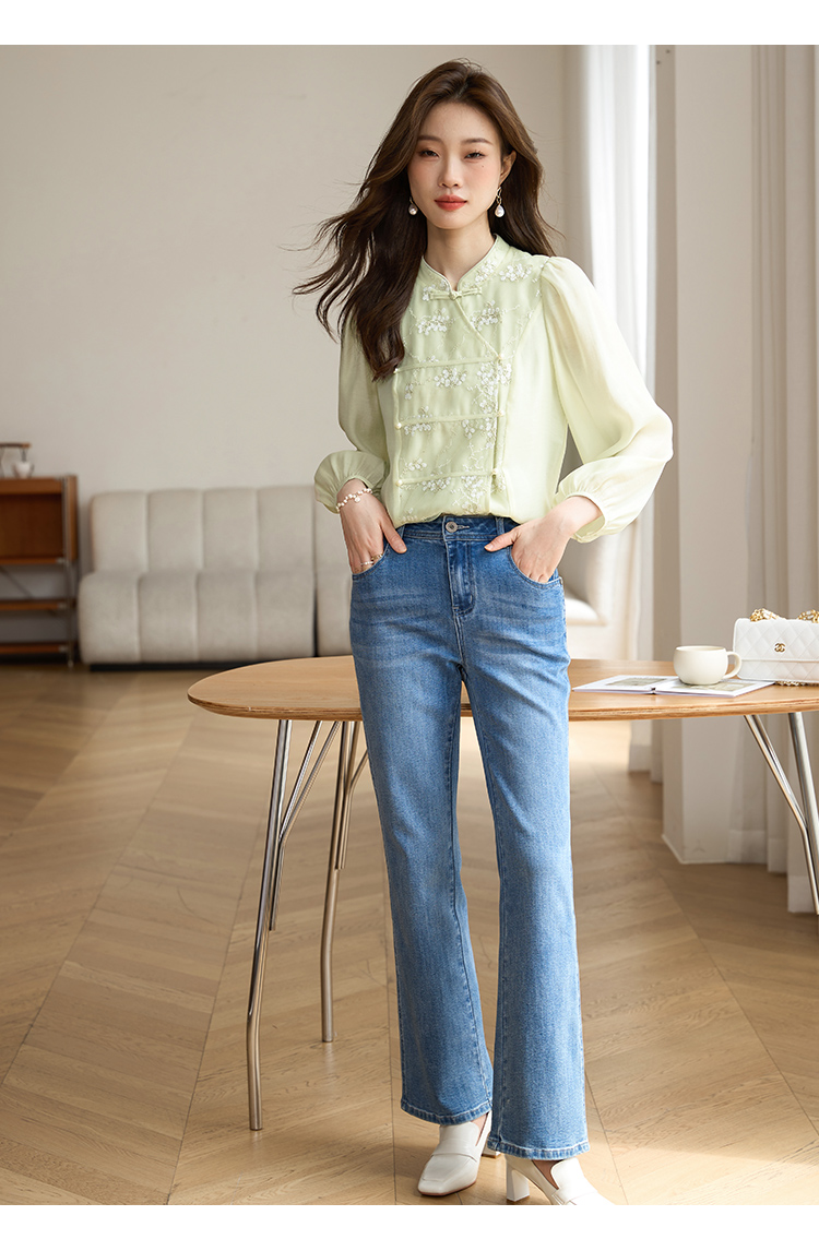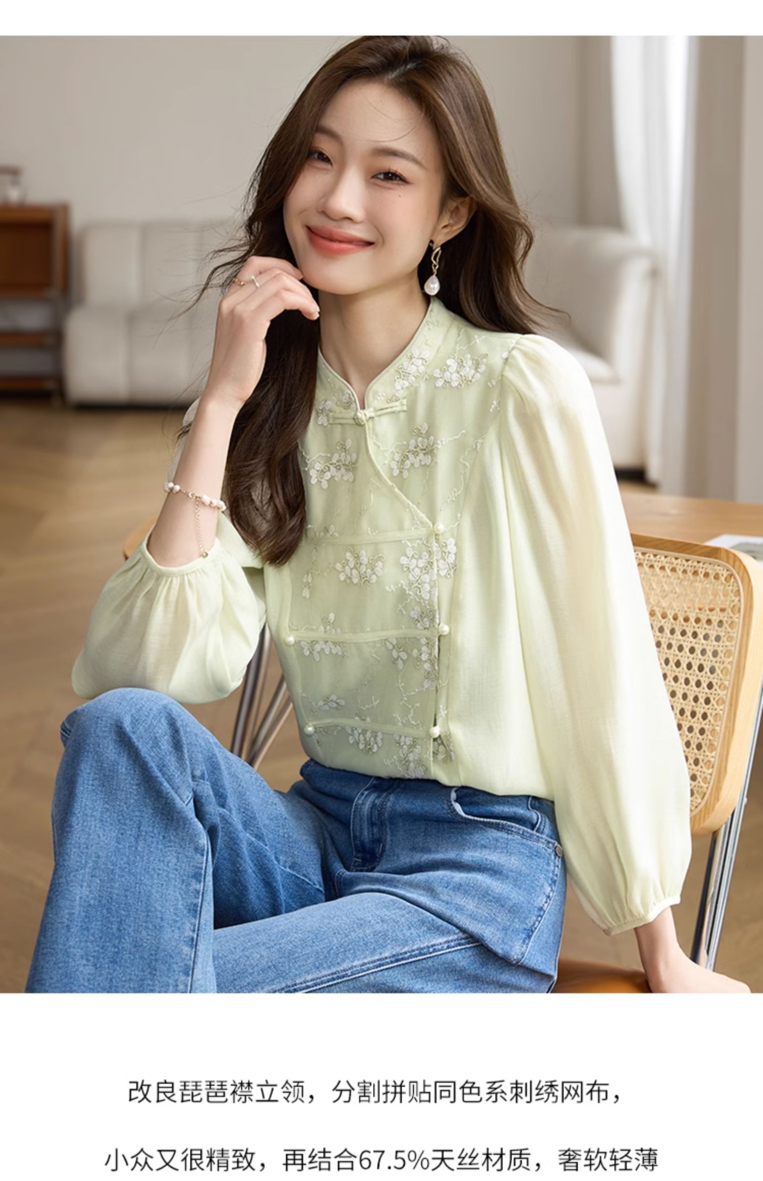 【1件72折】熙世界新中式国风刺绣盘扣衬衫女秋季新款气质灯笼袖立领天丝上衣