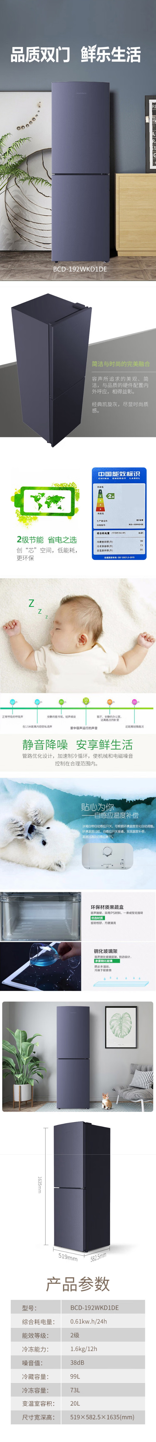 容声 冰箱 BCD-192WKD1DE 192升 双门 二级能效 风冷 定频 两侧散热 PCM彩涂板 墨韵灰