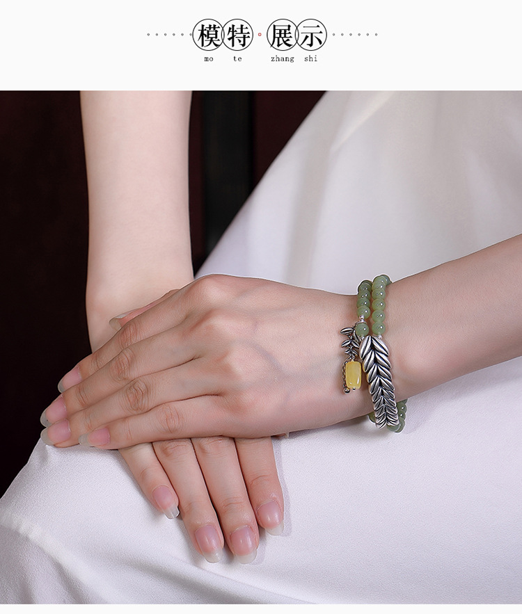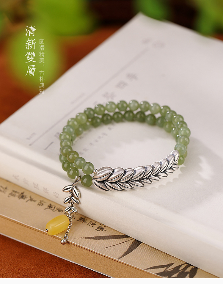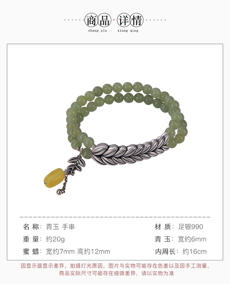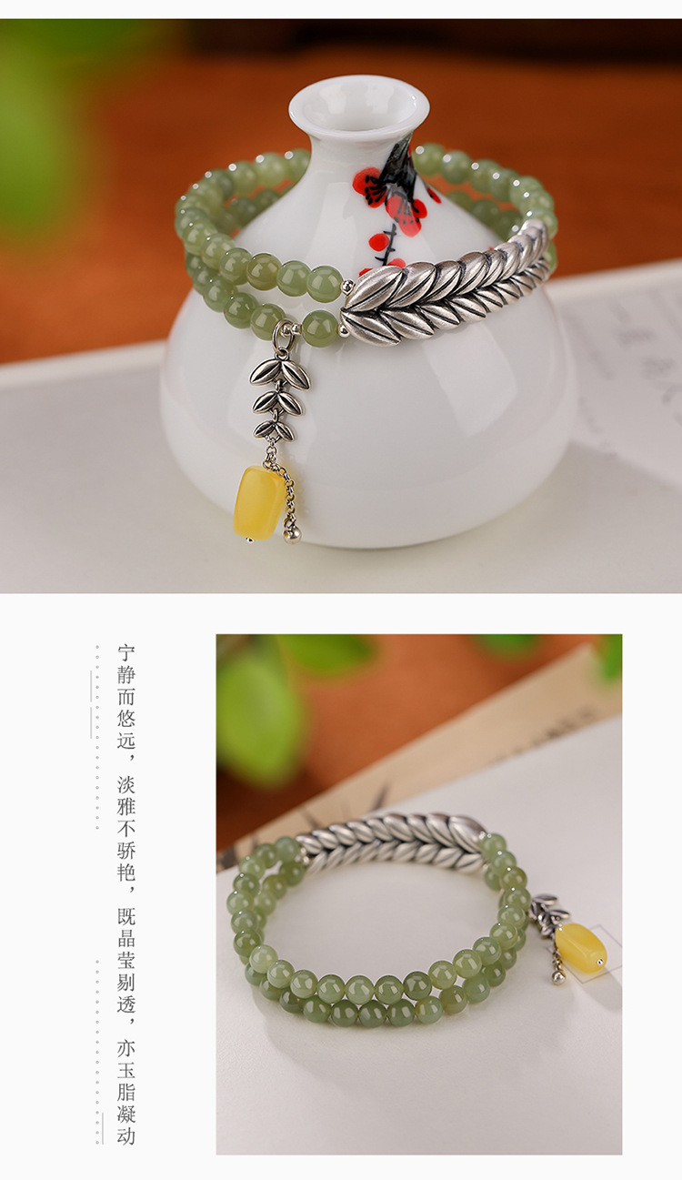 【晴烟】S990银足银蜜蜡和田青玉圆珠麦穗双圈手串【CW-80407】